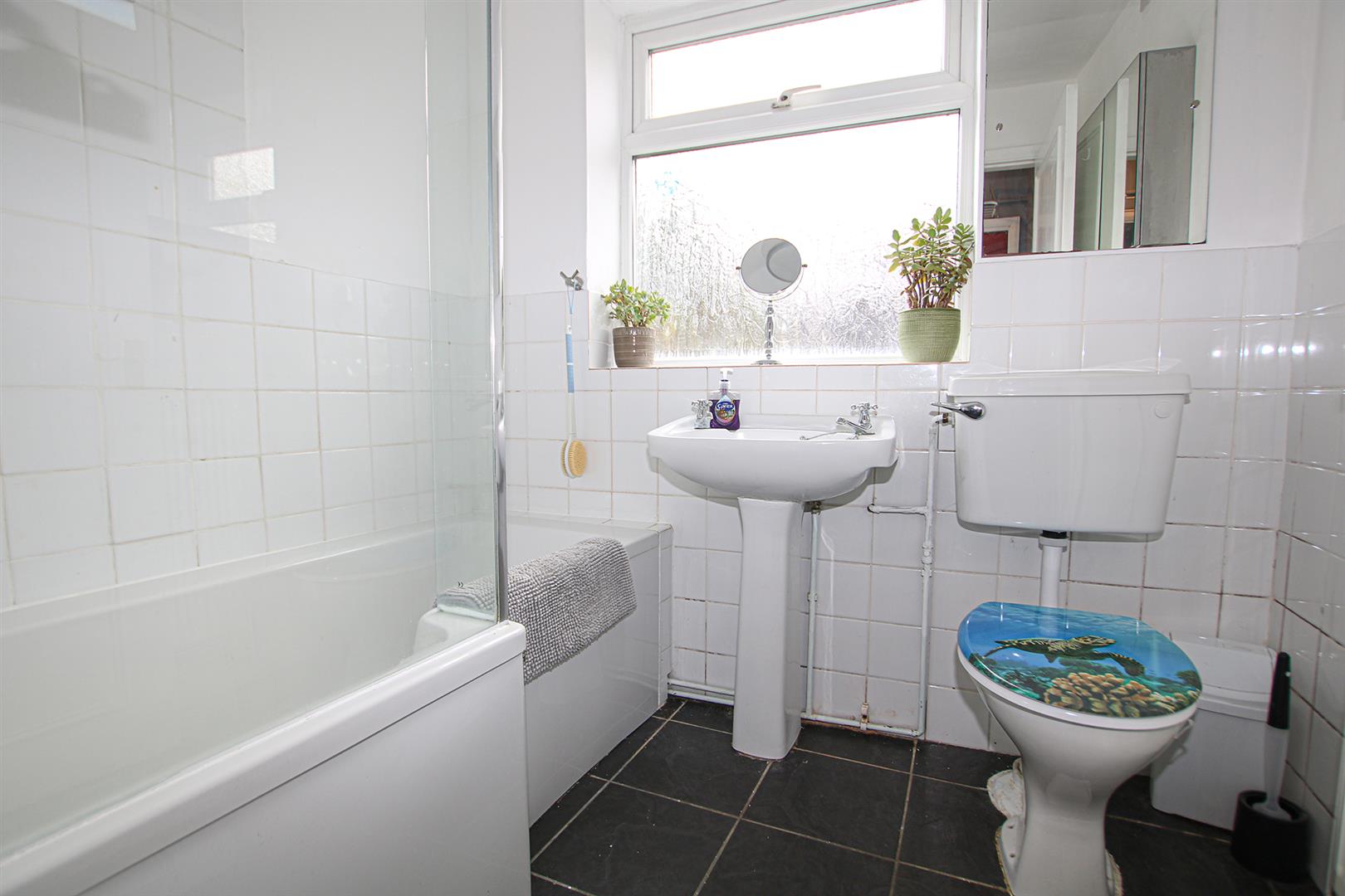 White suite comprising low level W.C., pedestal hand basin and P-shaped panelled bath with wall mounted shower over. Tiled flooring. Tiled to wet areas. Radiator. Obscured window.