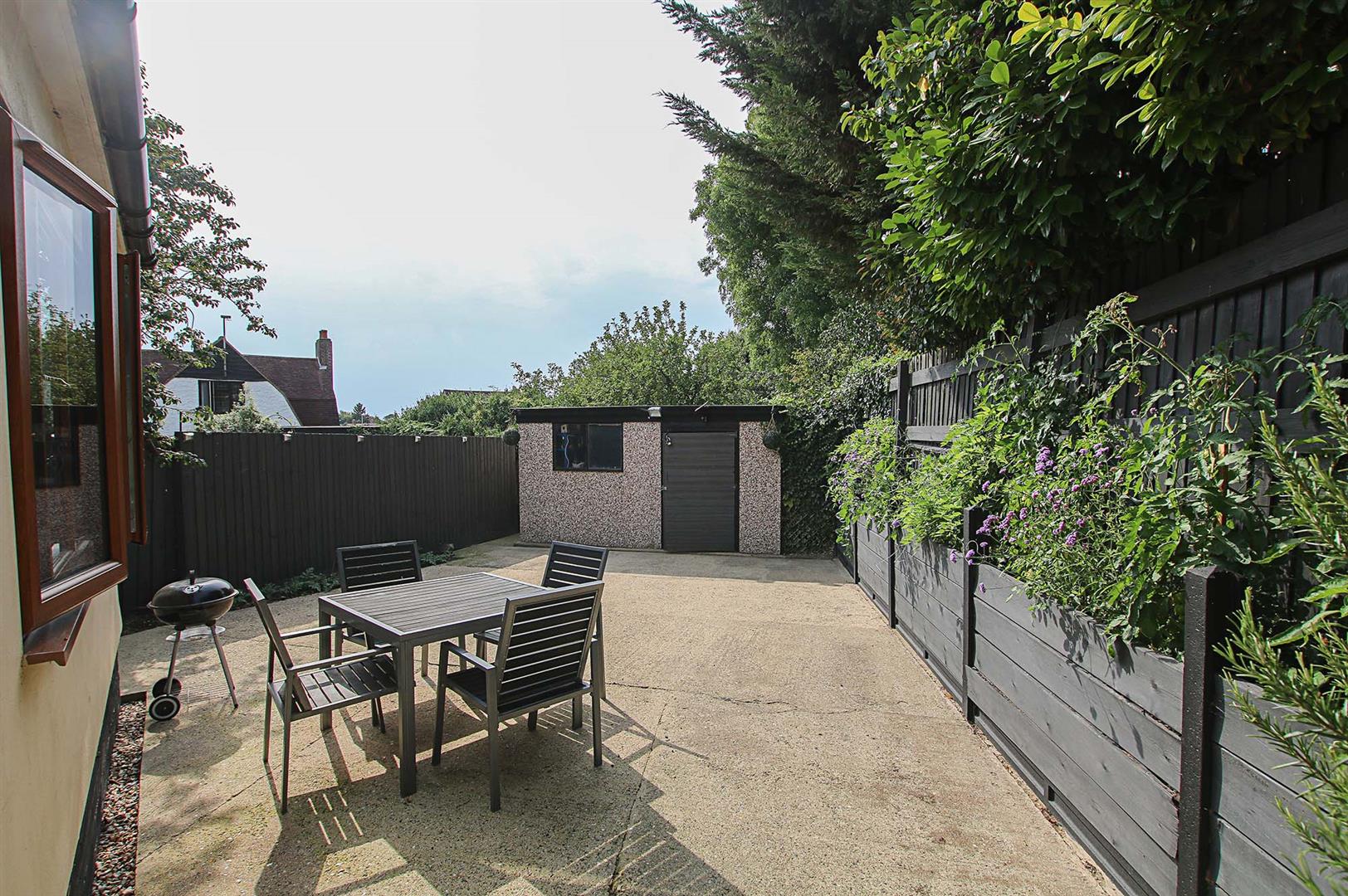 With raised shrub and flower beds, outside hot and cold tap and access to: