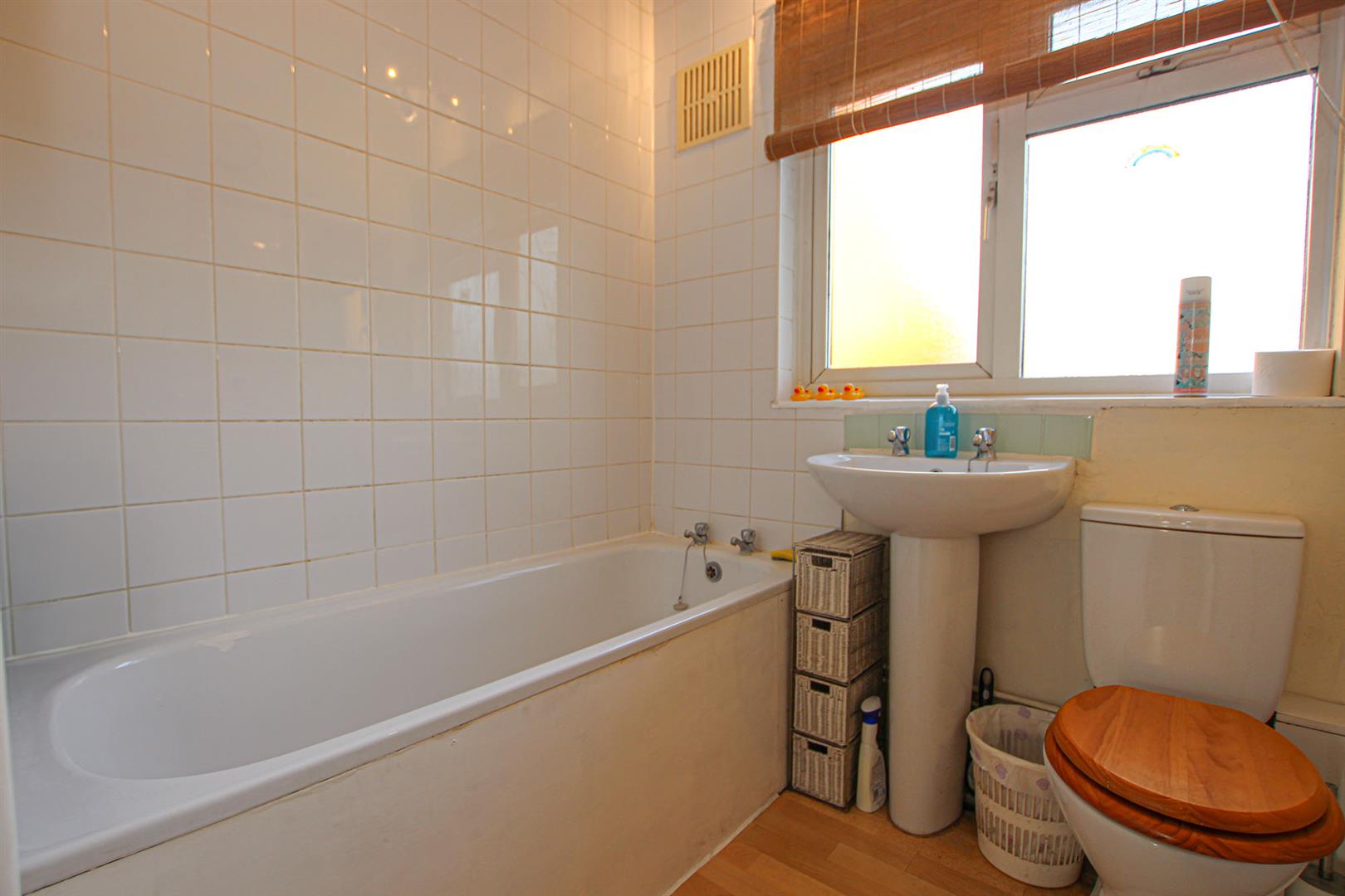 White suite comprising low level W.C., pedestal hand basin and panelled bath with tiled splashback. Wood effect flooring. Obscured window. Radiator. Door to landing
