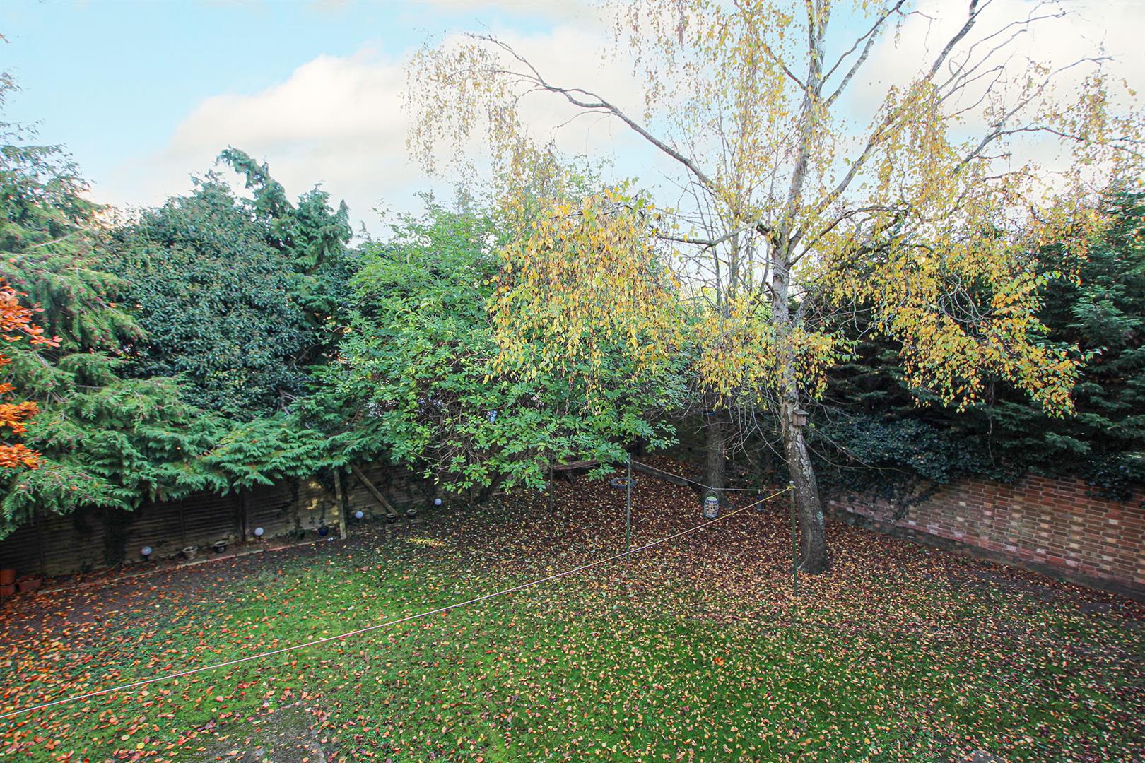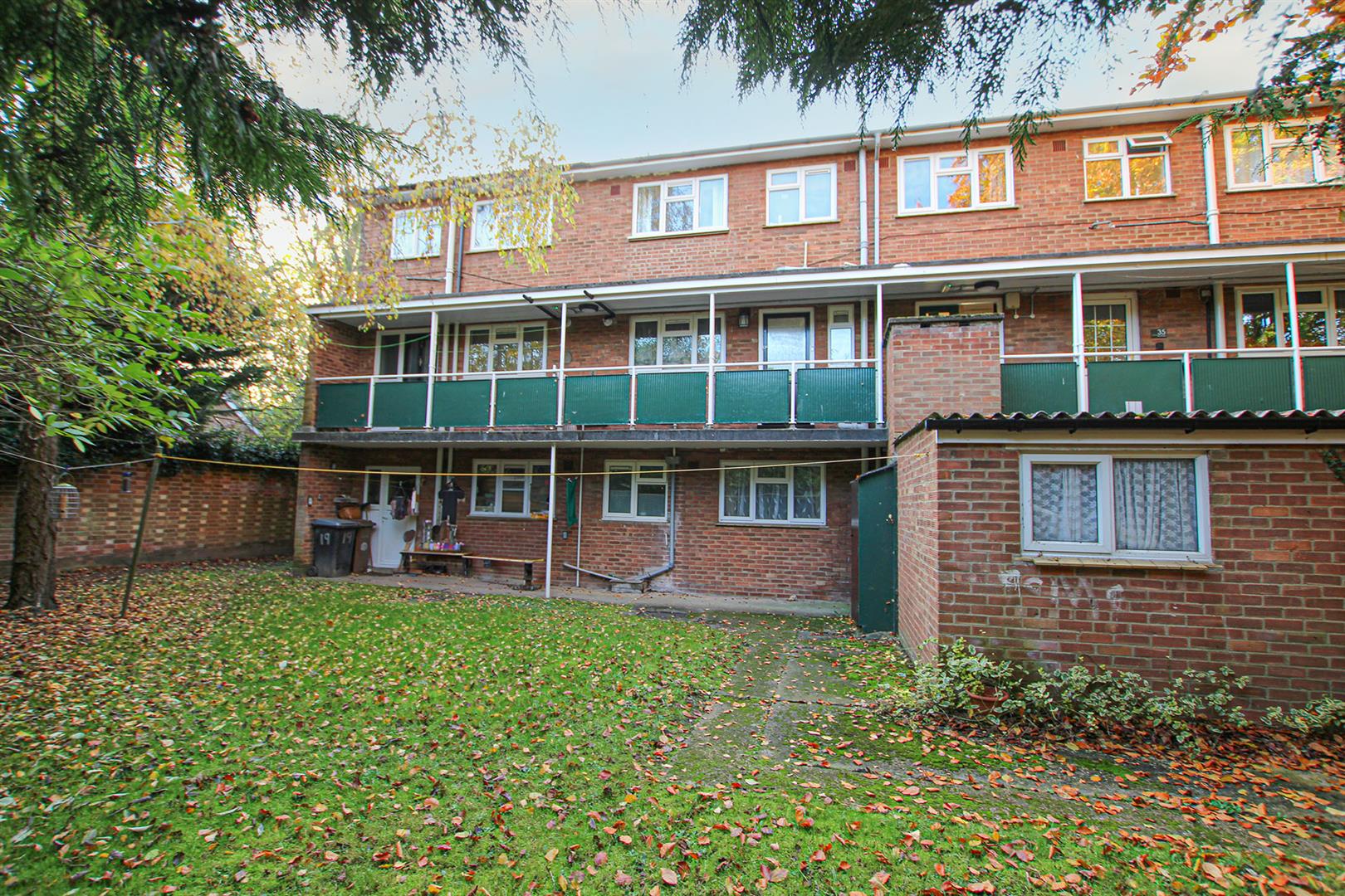 Communal balcony/walkway overlooking communal rear gardens. The property also includes a brick-built storage room/shed at ground floor level.