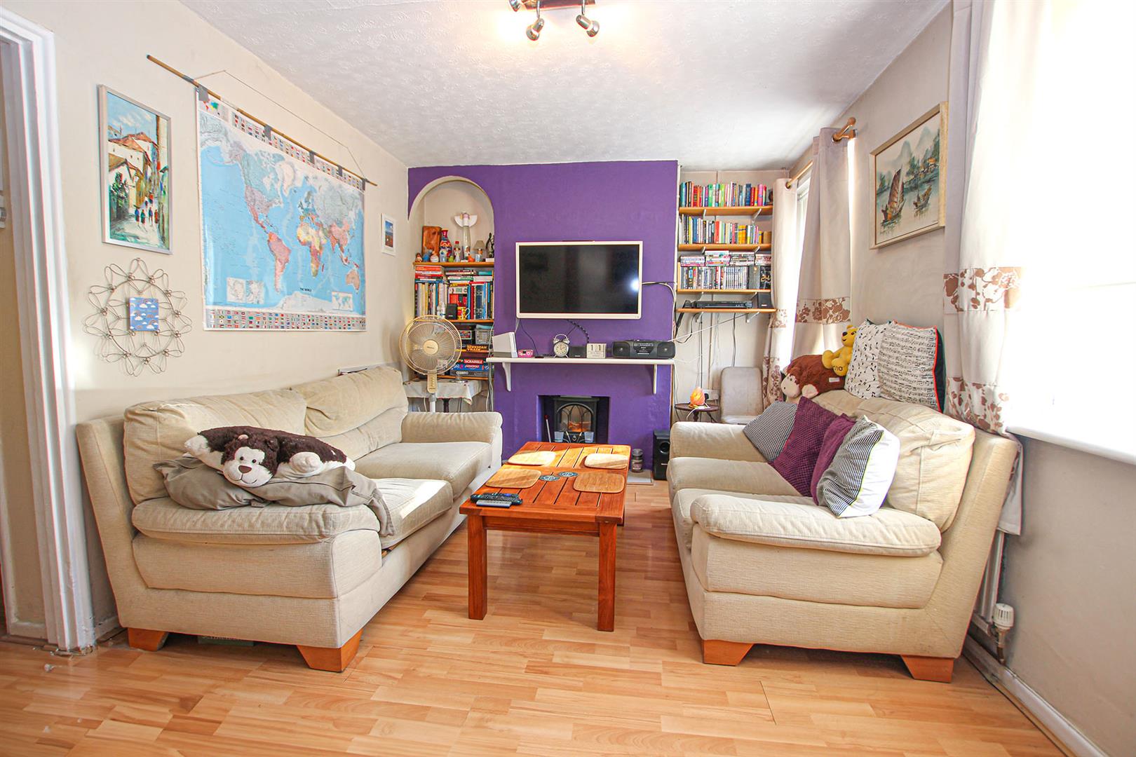 Sizeable living room with dual windows overlooking front aspect. Chimney breast with alcove shelving either side. Wood effect flooring. Radiator. Opening to entrance hall and built-in under-stairs cupboard.