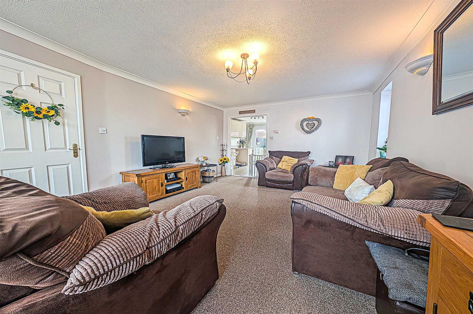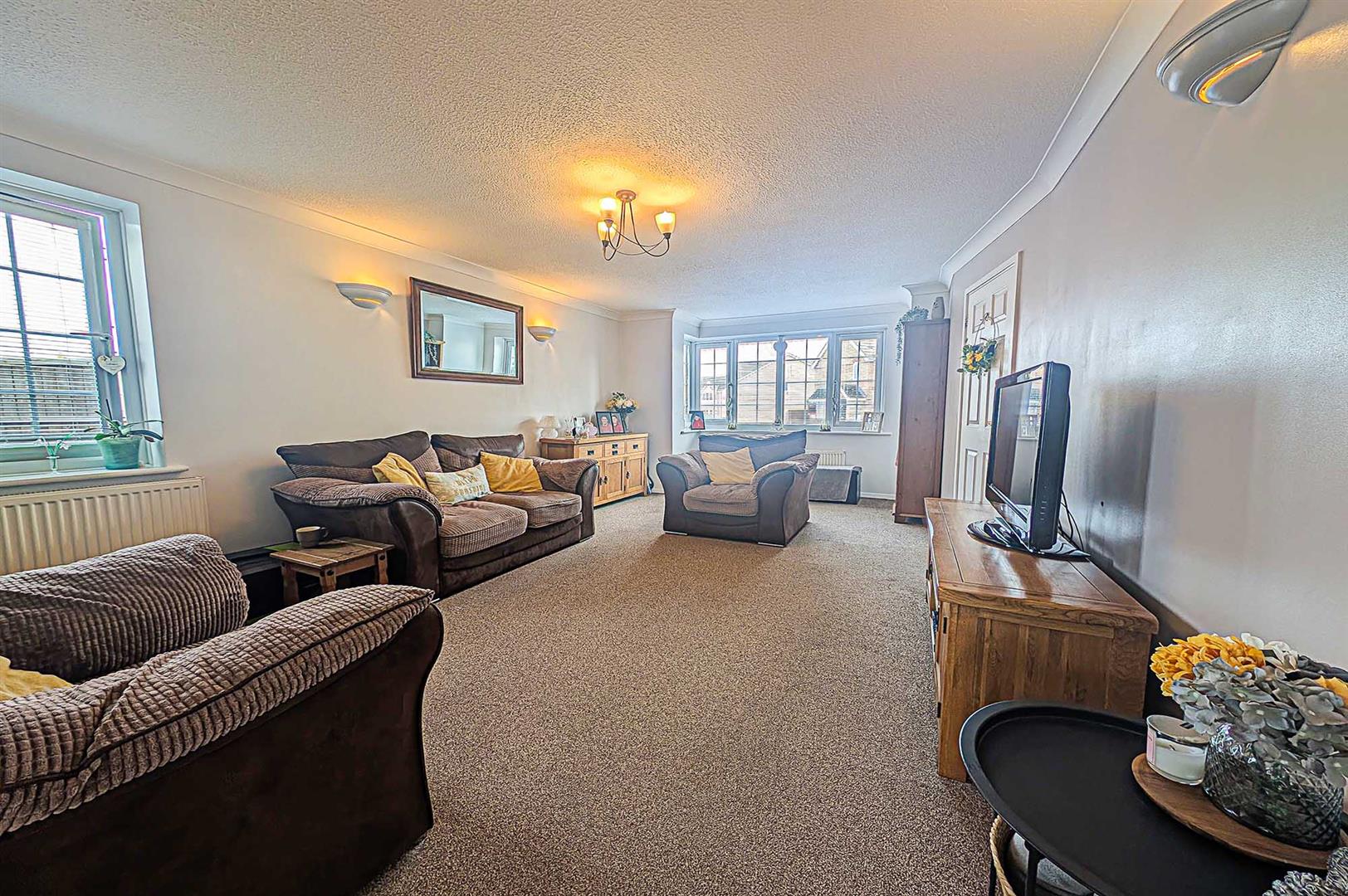 Spacious living room with TV connection point, wall lighting, radiators, window to the side aspect and bay fronted window. Opening through to the: