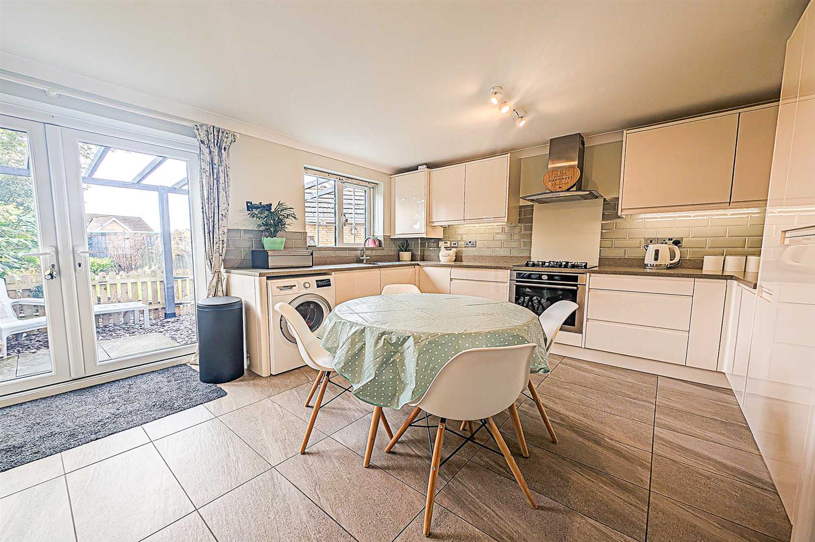 Modern kitchen fitted with matching eye and base level storage units and working surfaces over, tiled splashback areas, inset stainless steel sink and drainer with mixer tap over, integrated oven, gas hob, microwave, fridge/freezer and dishwasher. Space and plumbing for a washing machine. Breakfast bar, tiled flooring, radiator, window and French doors to the rear aspect.