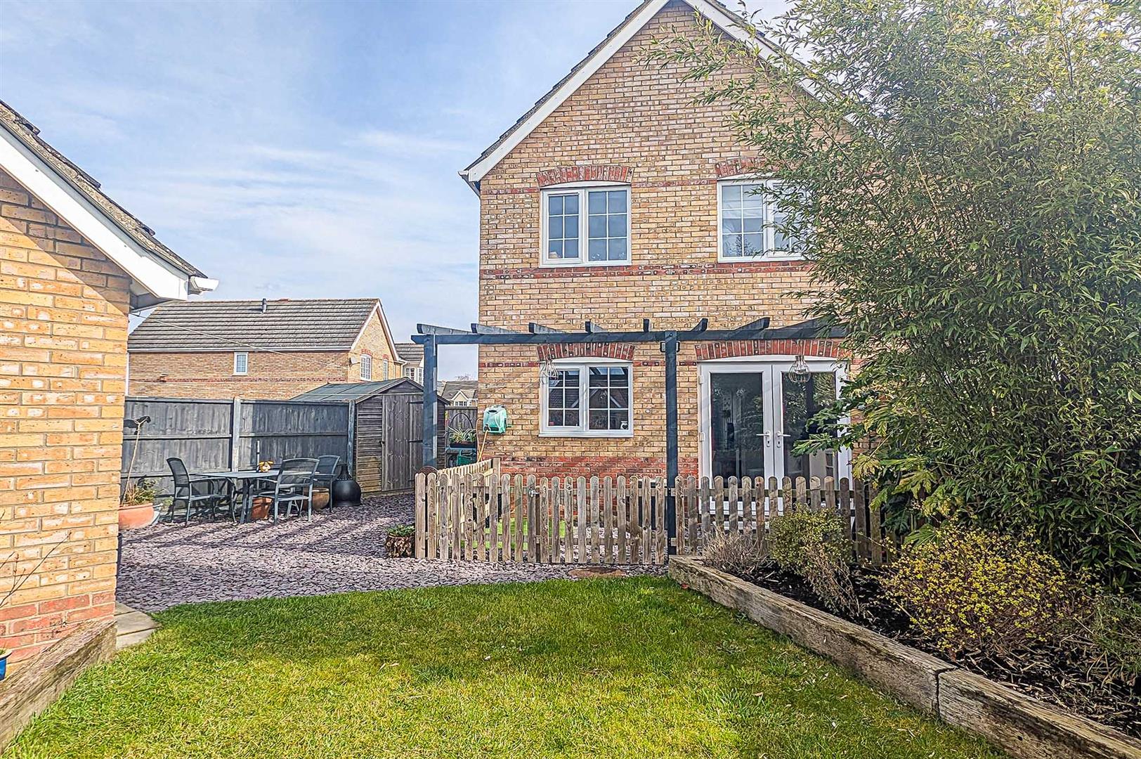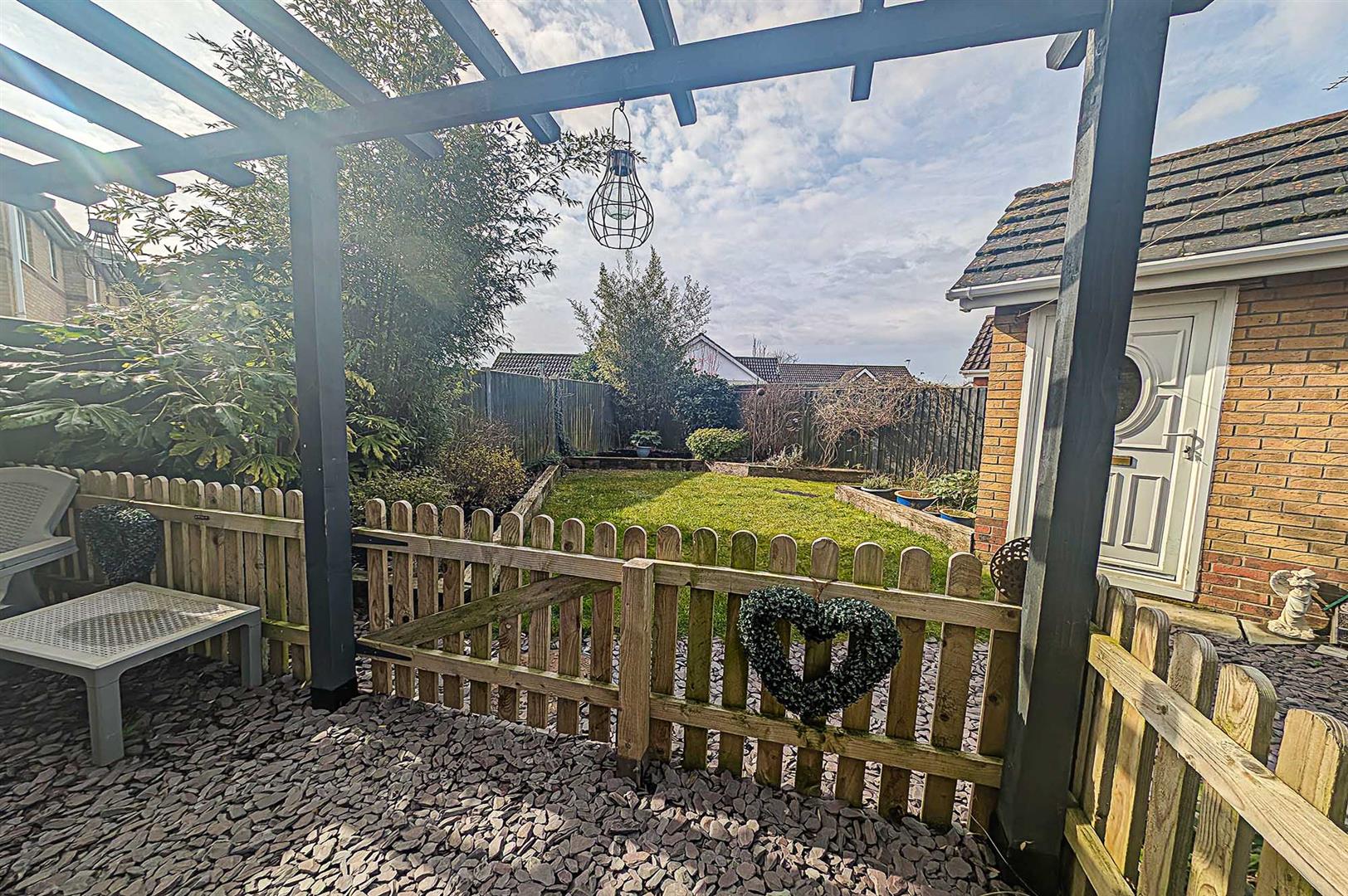Well landscaped rear garden mostly laid to lawn with timber built flower borders containing a variety of mature shrubs and flowers, enclosed shingled area with wooden pergola.