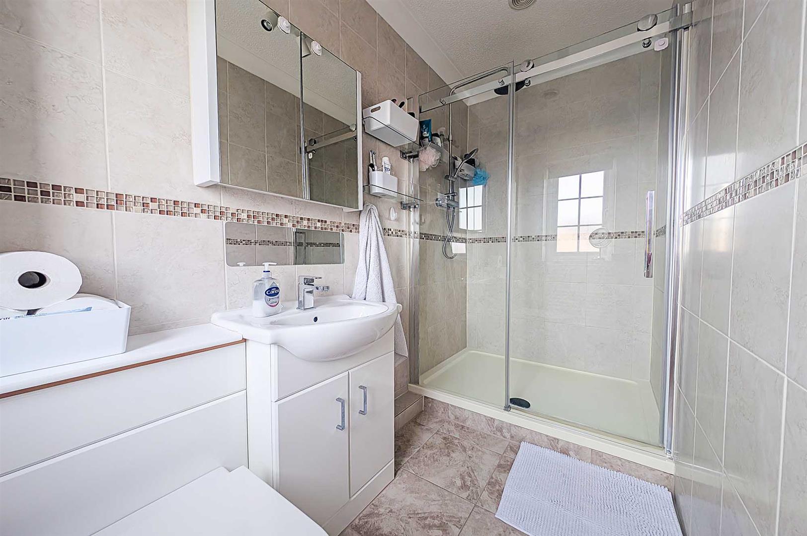 Ensuite comprising a concealed WC, hand basin with vanity cupboard under, walk-in shower cubicle with sliding glass door, tiled walls and flooring and ladder style heated towel rail.