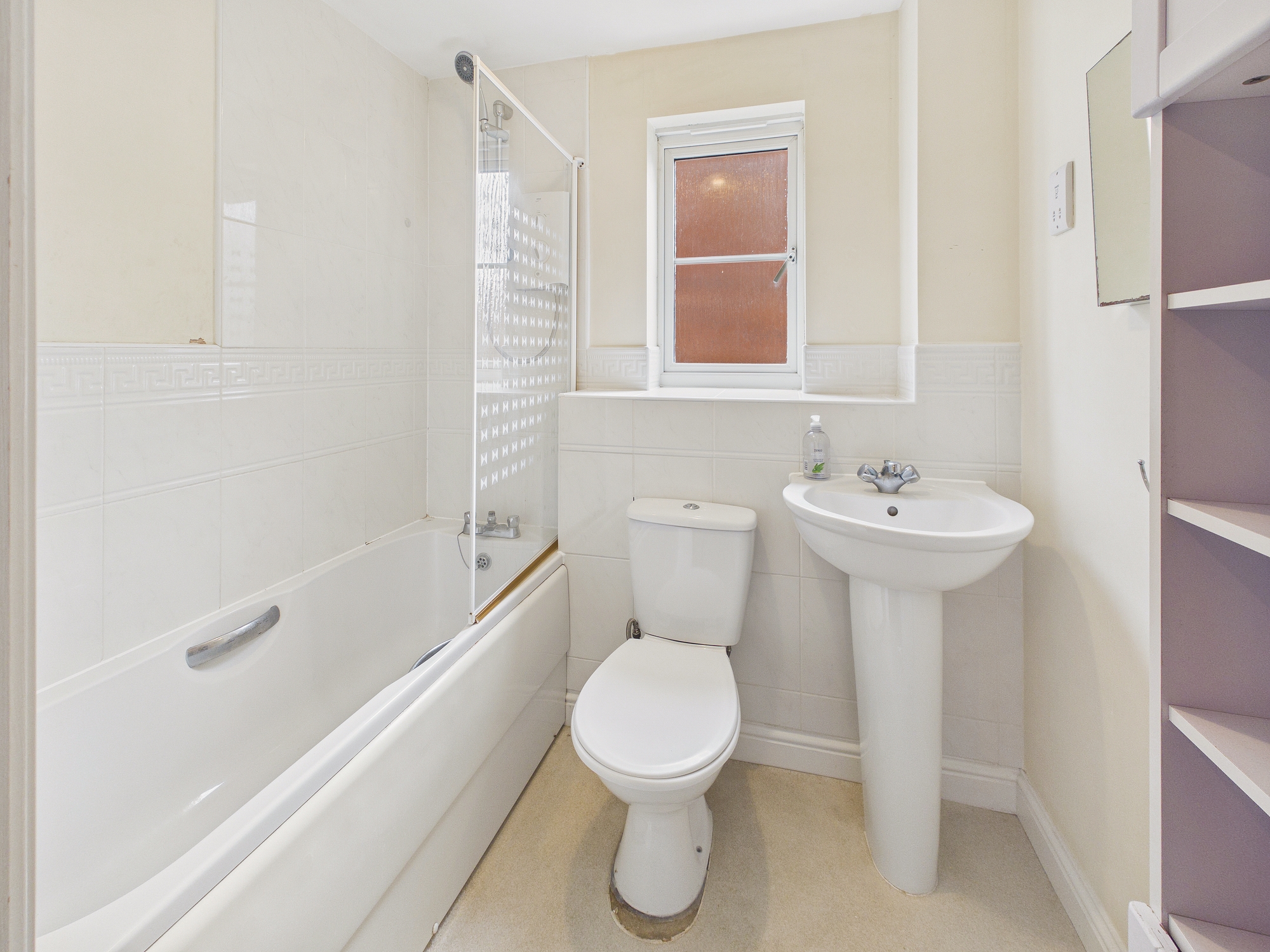 Panelled bath with electric shower over, low level w.c., handwash basin, extractor fan, electric fan heater.