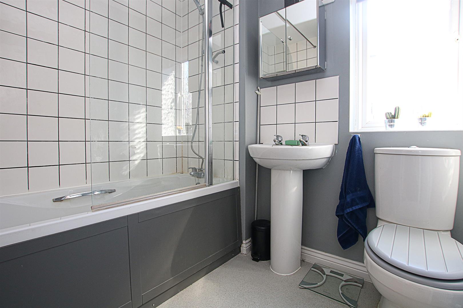 White suite comprising low level W.C., pedestal hand basin and panelled bath with mixer tap over, wall mounted shower, fixed glass screen. Tiled throughout wet areas. Obscured window to front aspect. Radiator.
