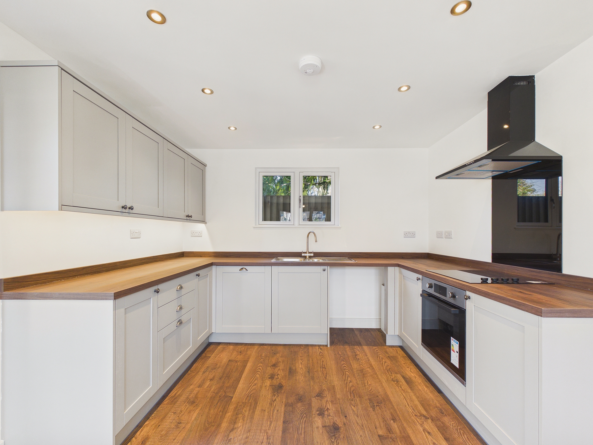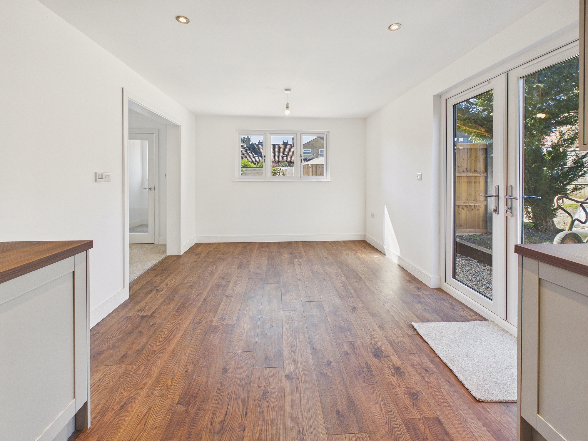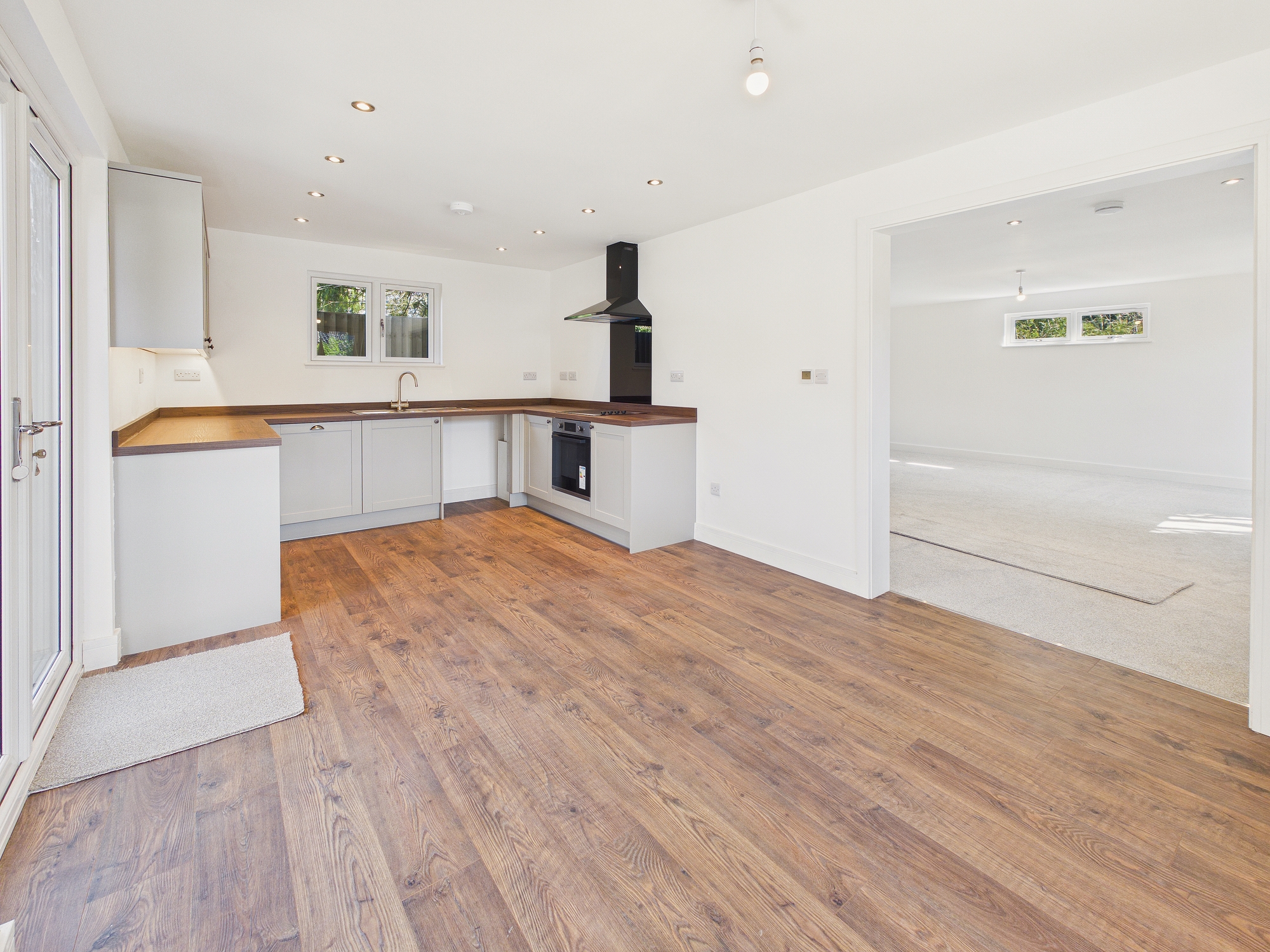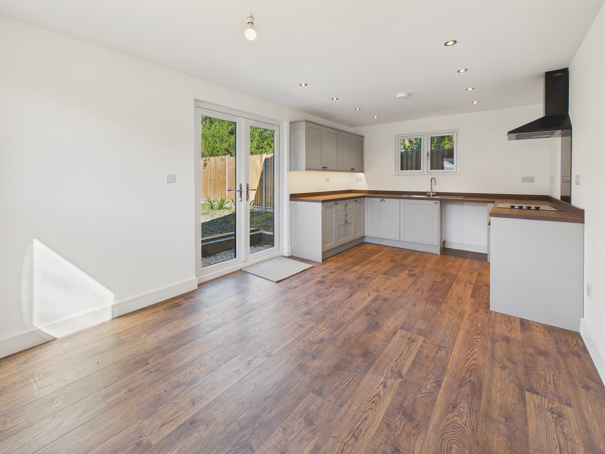 uPVC double glazed window to front and rear, uPVC double glazed patio doors to garden, laminate under floor heating, wall and base units under worksurfaces, 1 1/2 stainless steel sink drainer inset with mixer tap over, 4 ring electric hob inset to worksurfaces with oven under, glass splashback and extractor over, integral dishwasher, space for washing machine, space for fridge/freezer, under counter lighting, ceiling spotlights, opening through to:-
