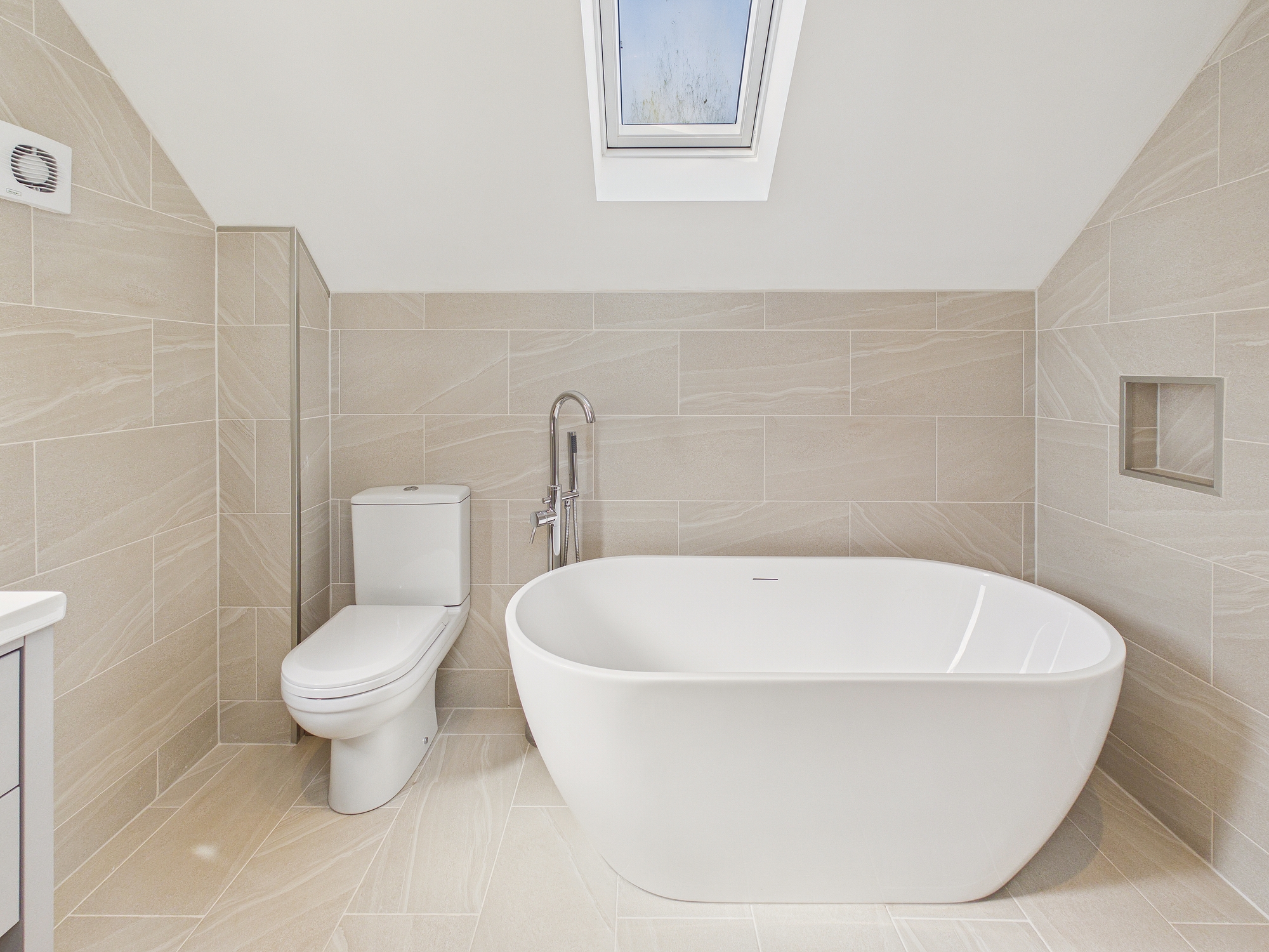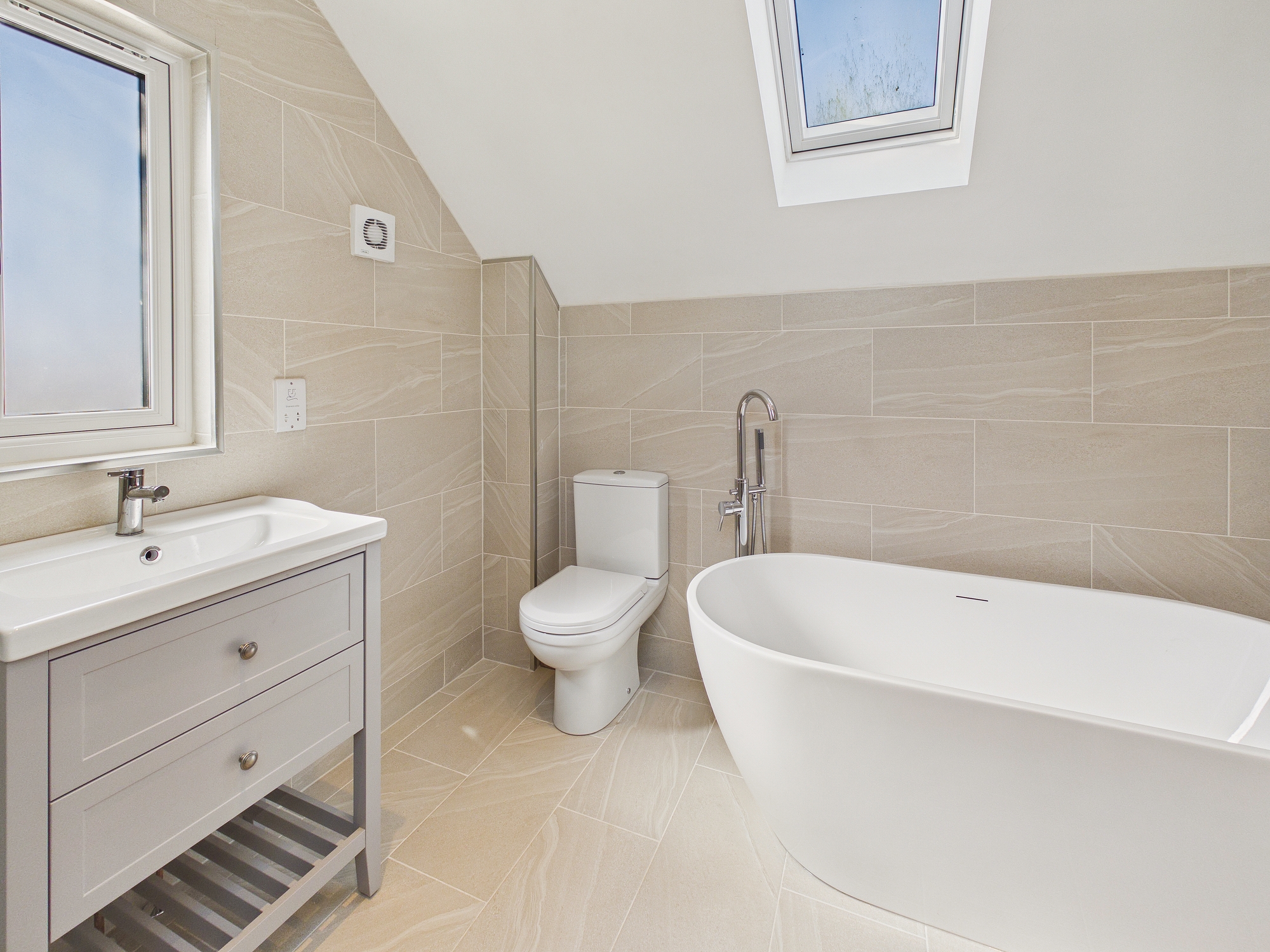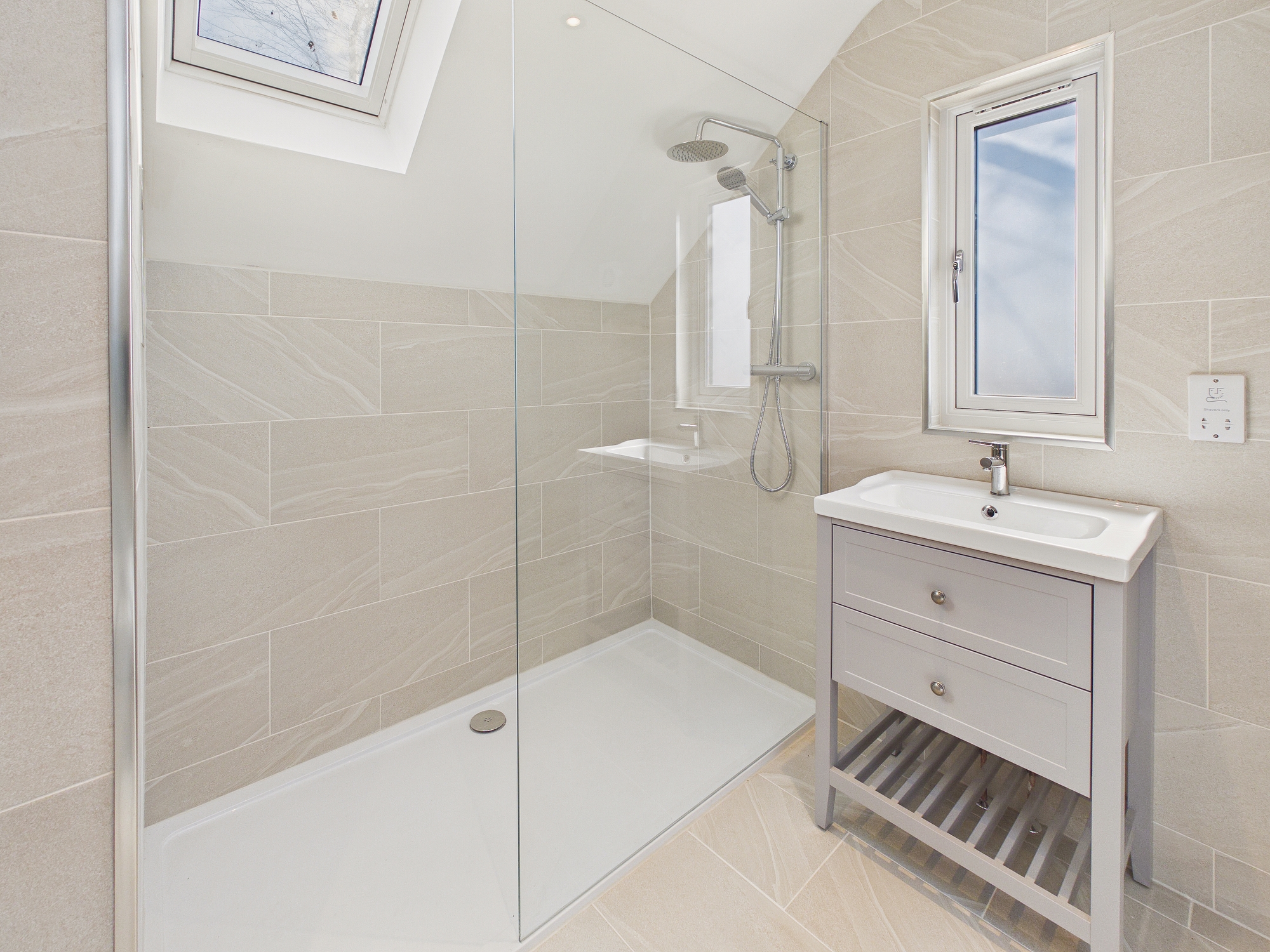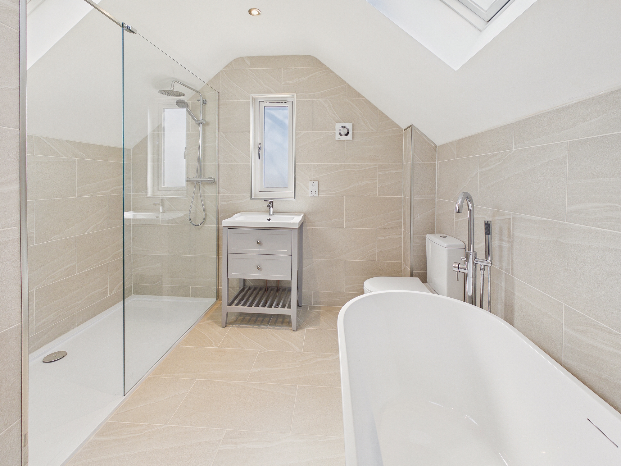 uPVC double glazed window to front, uPVC double glazed Velux style windows to both sides, free standing bath with raised mixer tap and display shelving over, walk in double shower with glass screen and display shelving, w.c., handwash basin inset to vanity unit, wall mounted heated towel rail, tiled walls and flooring, ceiling spotlights, shaver socket, extractor.