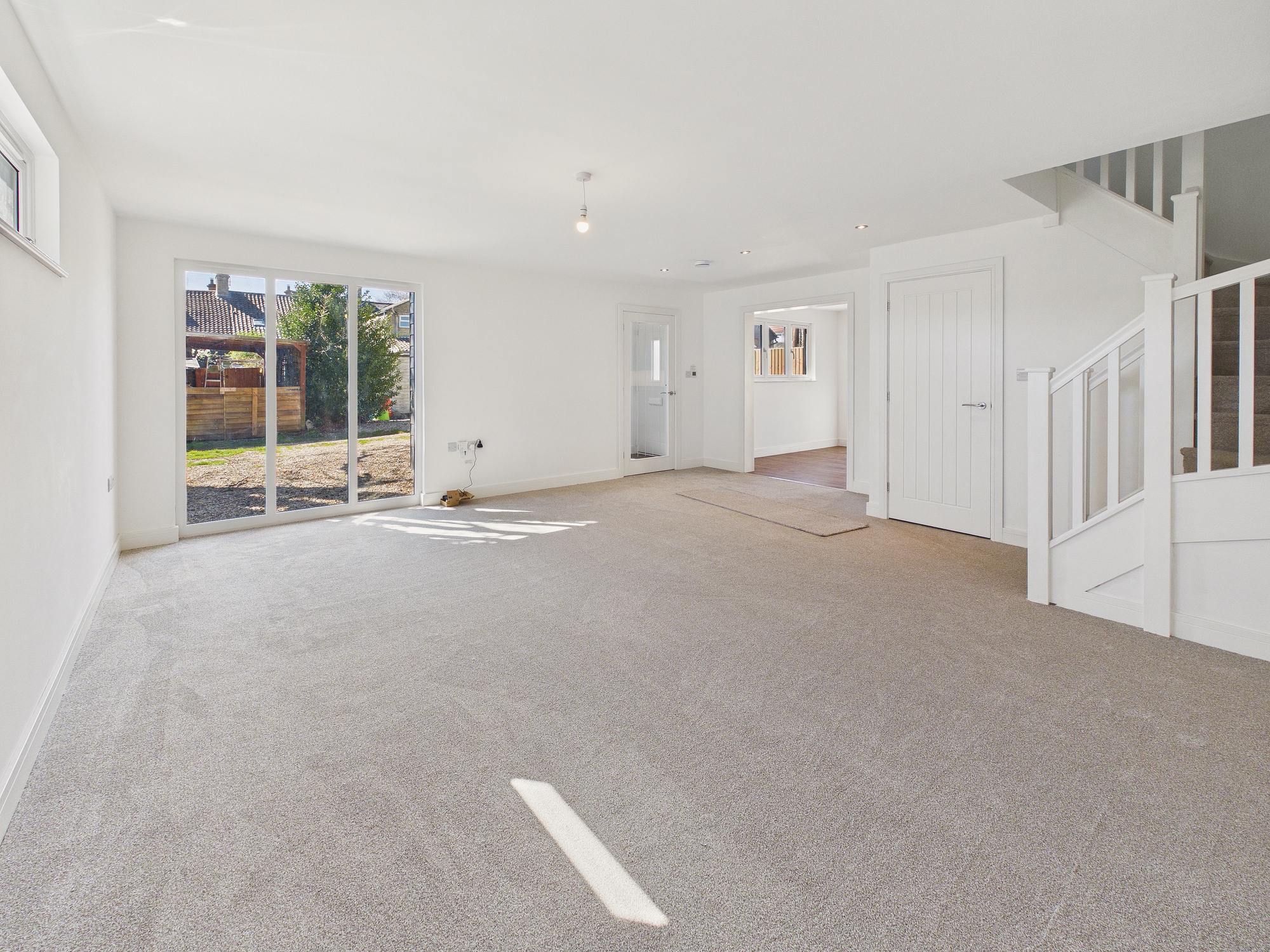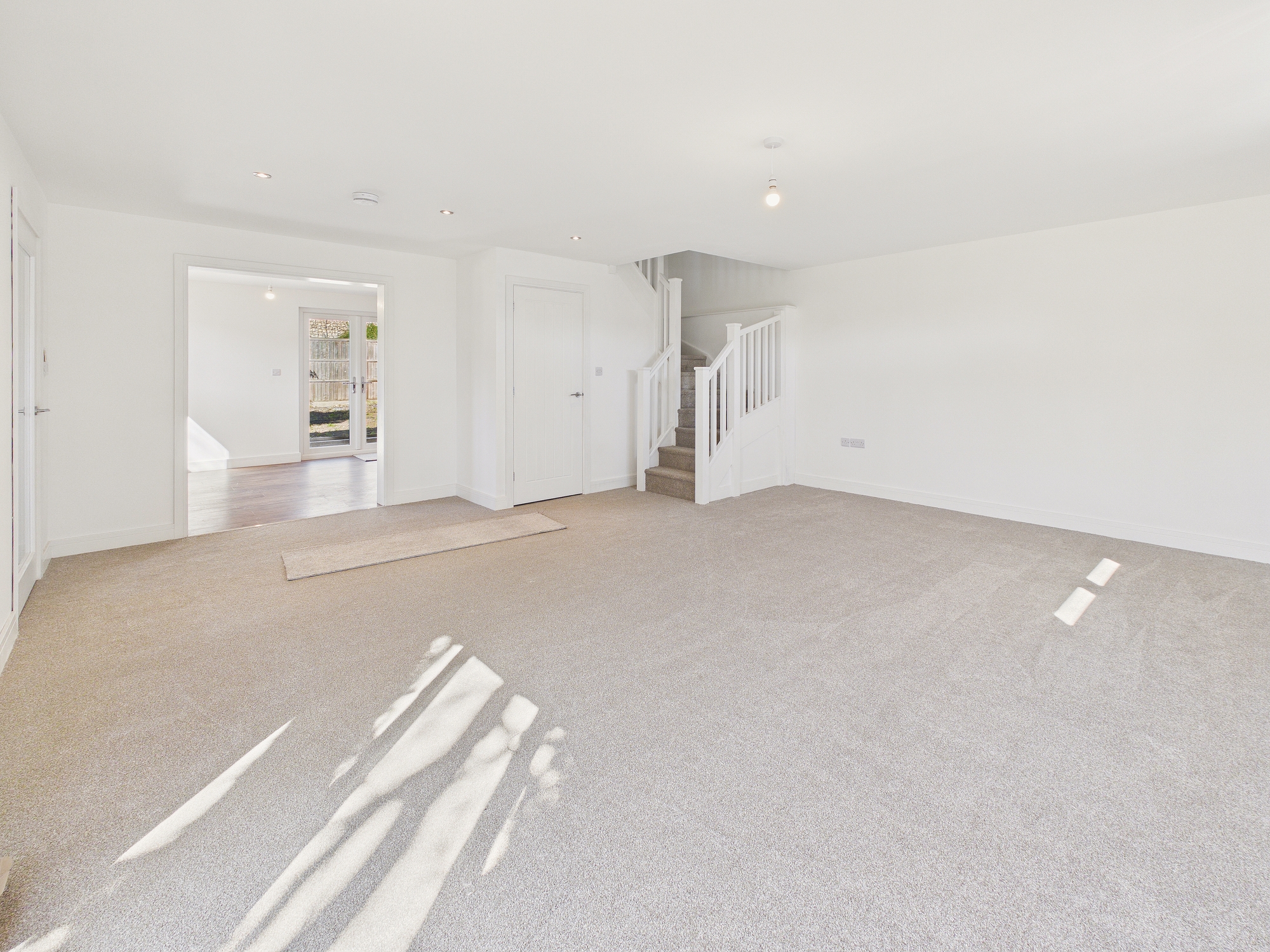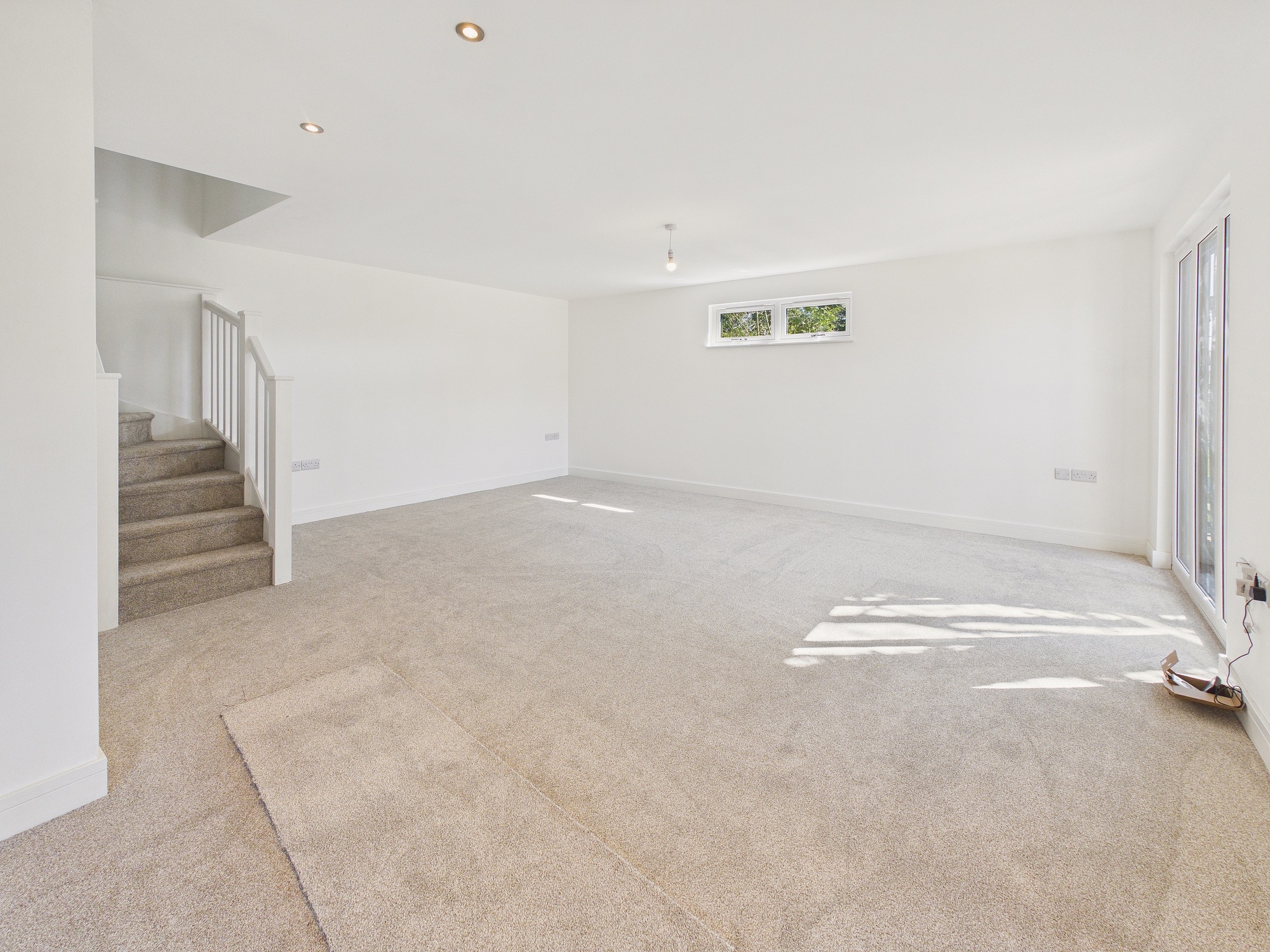 uPVC double glazed floor to ceiling window to front, uPVC double glazed high level window to side, underfloor heating, door to understairs airing cupboard with hot water cylinder, stairs to first floor, ceiling spotlights.