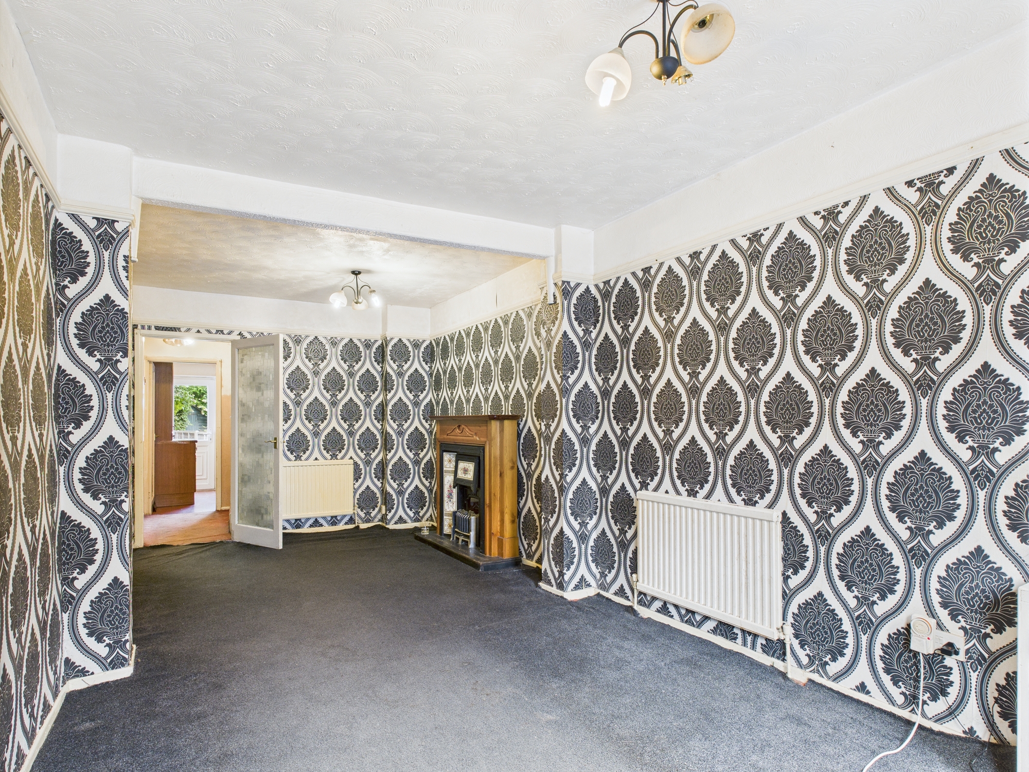 uPVC double glazed window to front, 2 x wall mounted double panel radiators, feature fireplace with wooden surround and mantle, textured ceiling, glazed door to:-