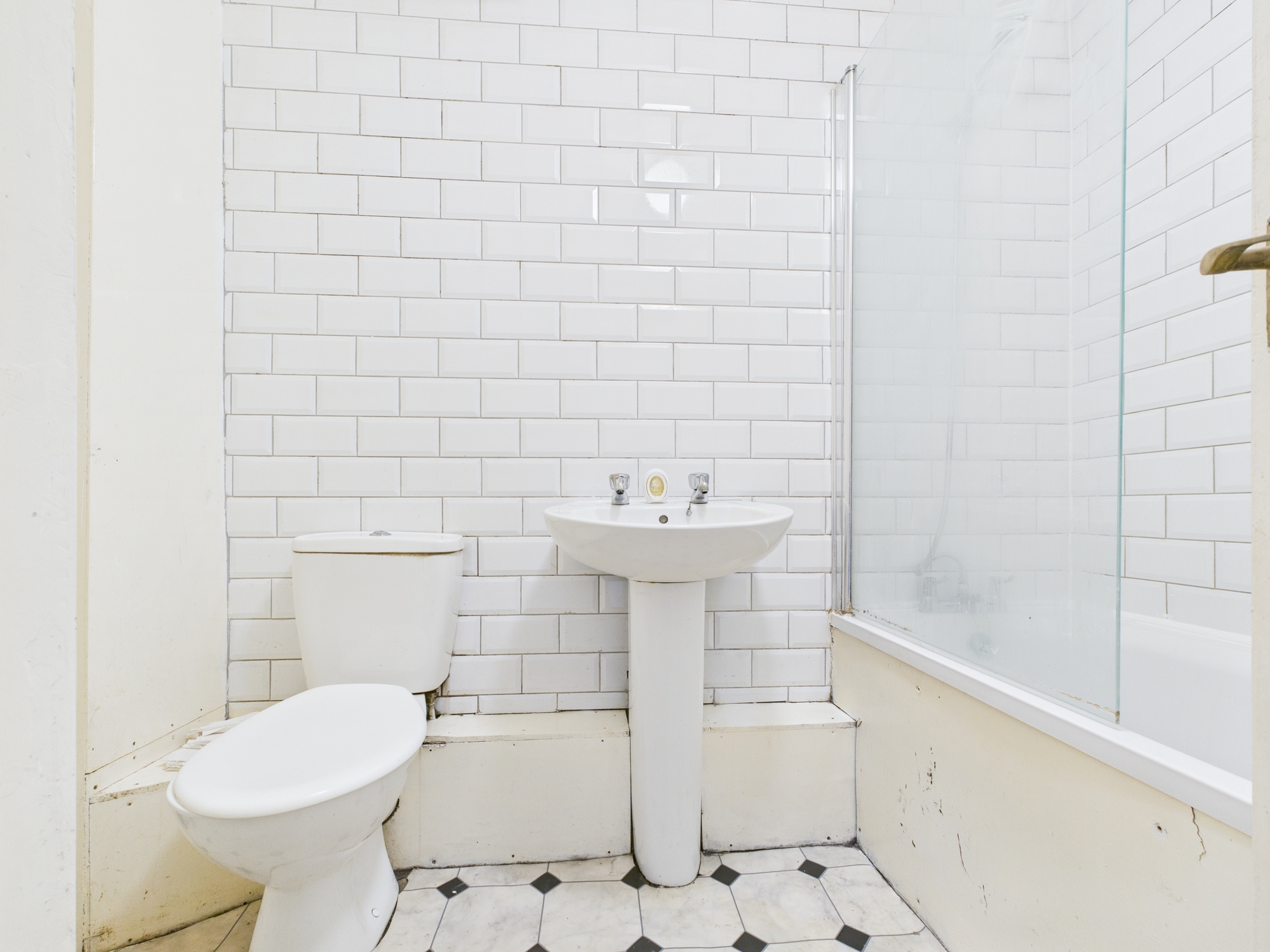Wall mounted single panel radiator, panelled bath with shower attachment and glass shower screen w.c., pedestal handwash basin, extractor, textured ceiling, lino style flooring, partly tiled walls.