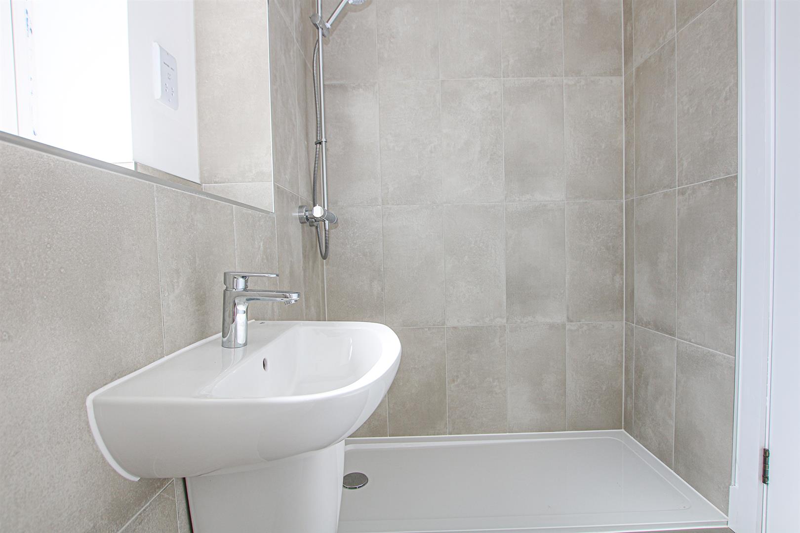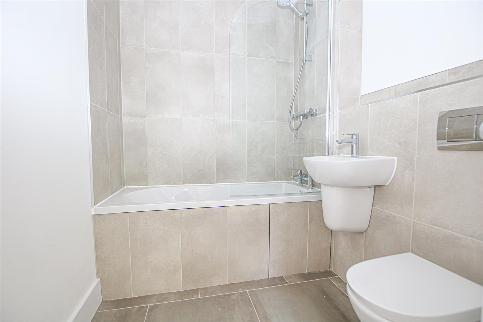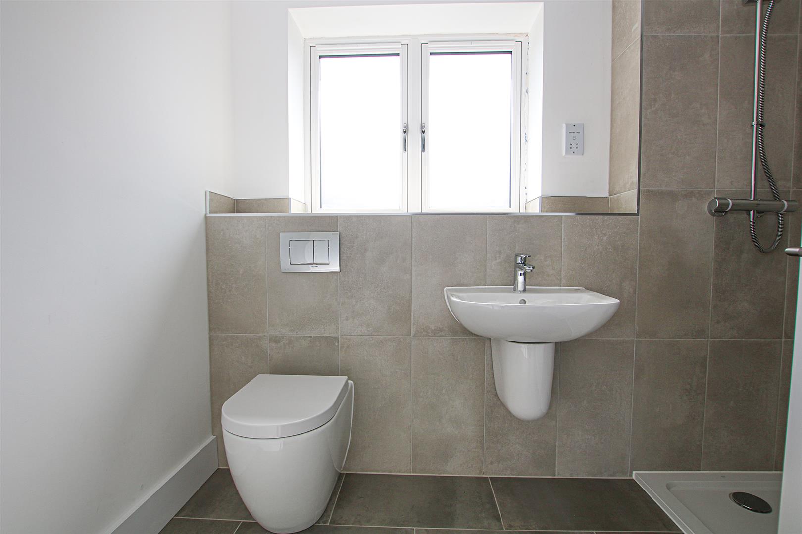 Three piece bathroom suite comprising a concealed WC, hand basin, walk-in shower unit, part tiled walls, tiled flooring and obscured window to the rear aspect.