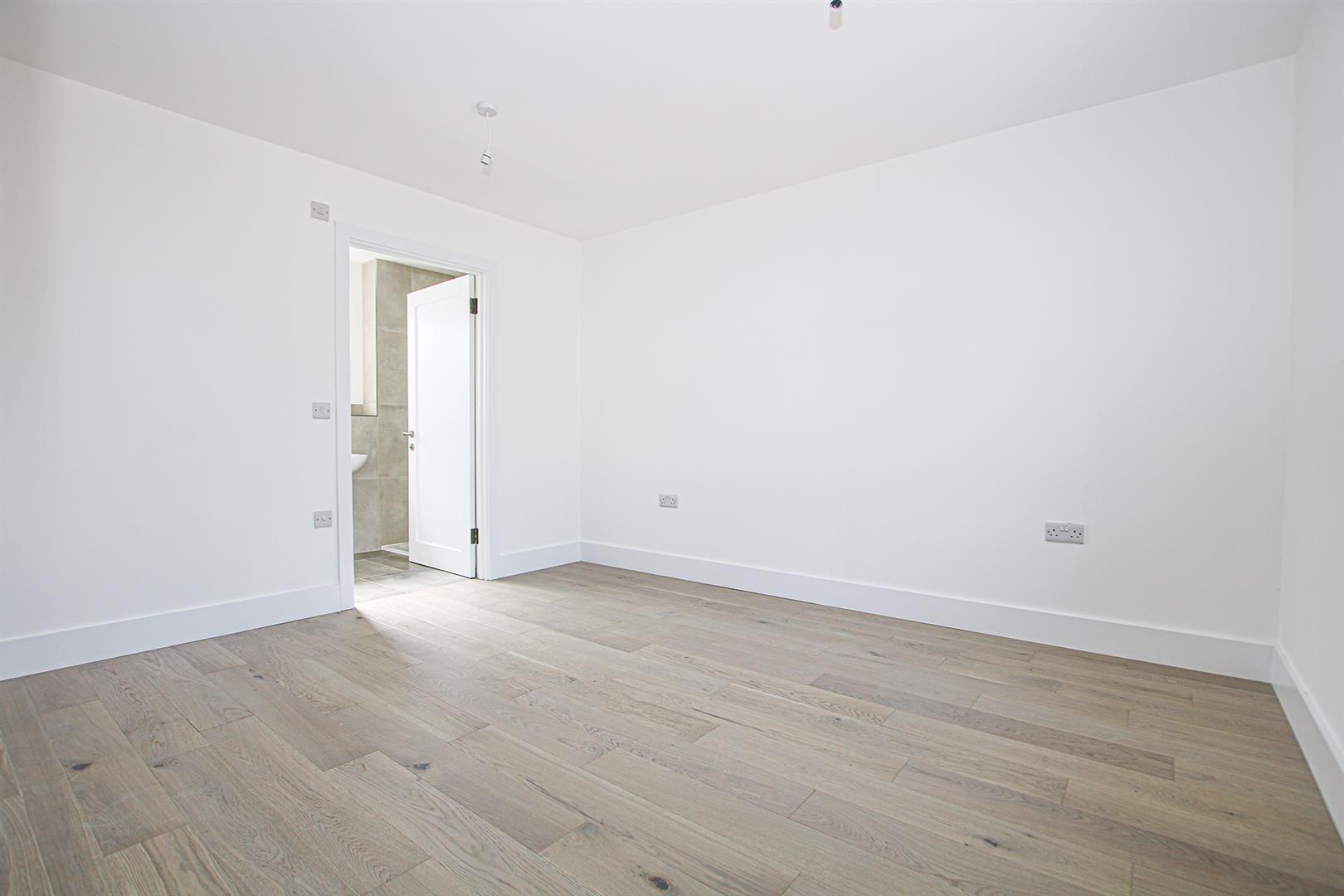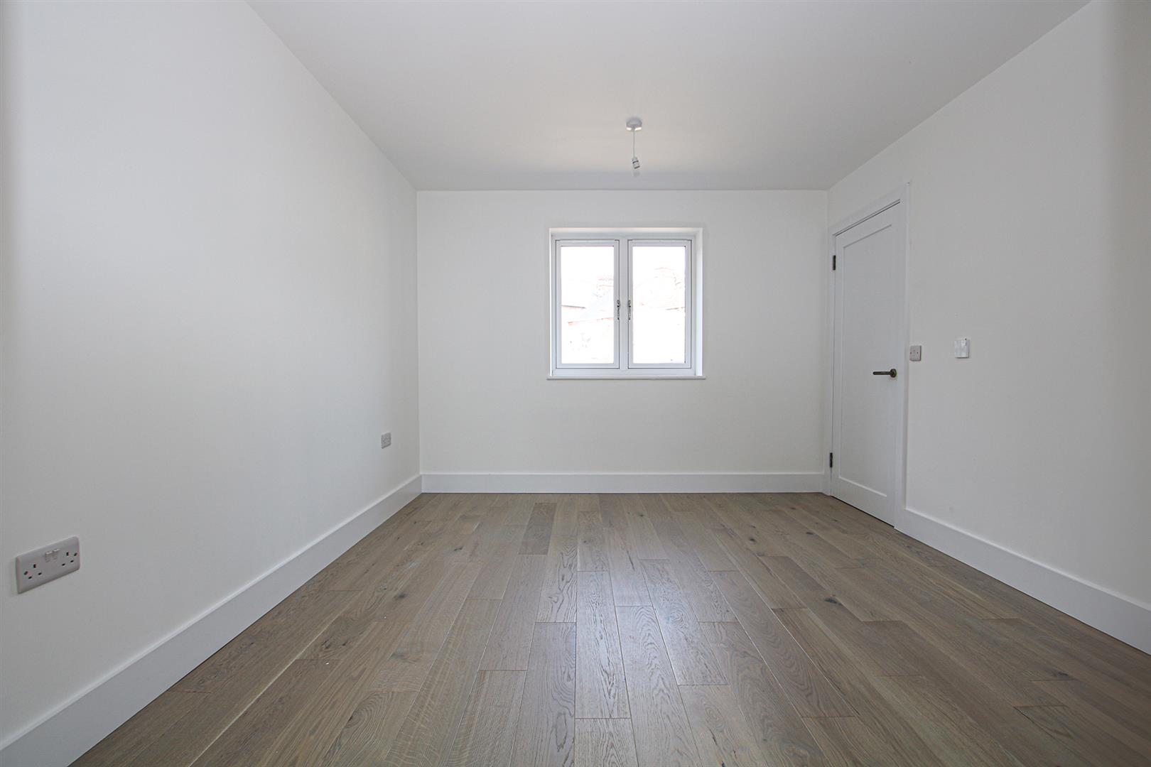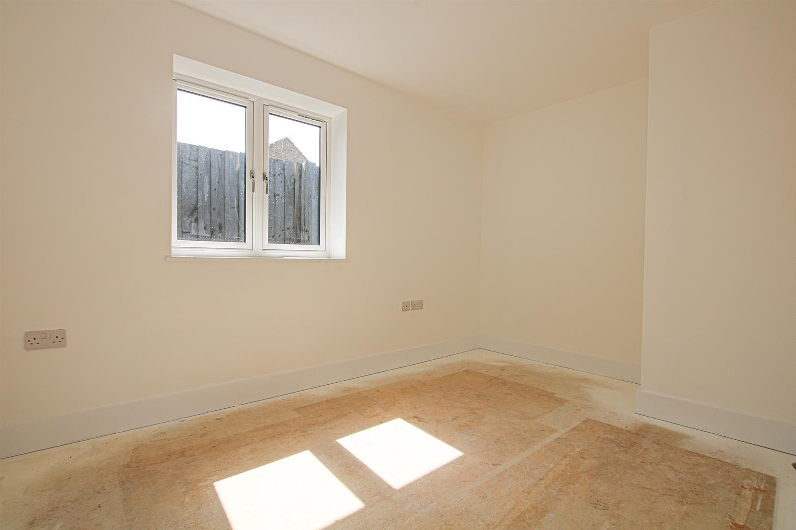 Three piece bathroom suite comprising a concealed WC, hand basin, walk-in shower unit, part tiled walls, tiled flooring and obscured window to the rear aspect.