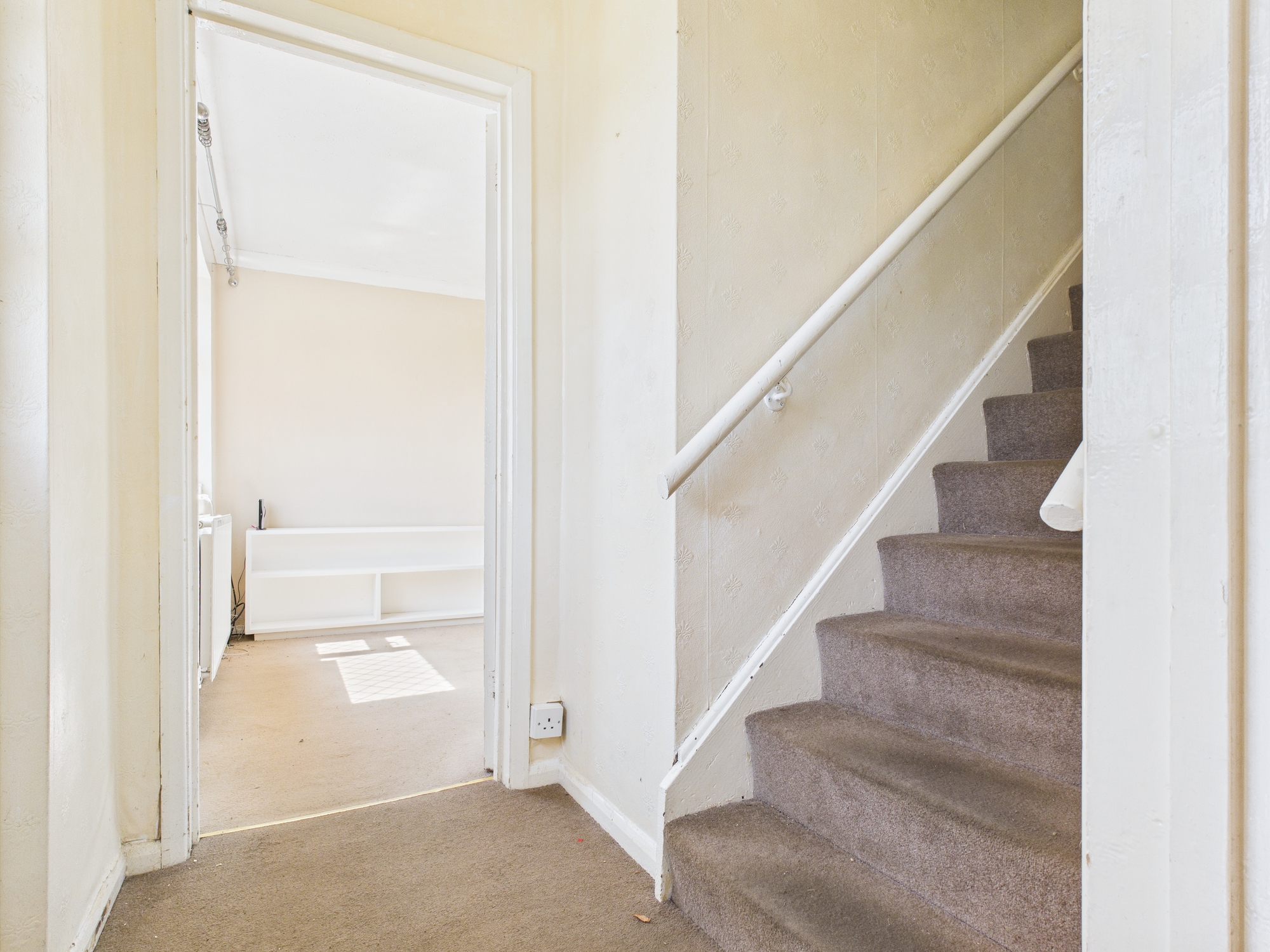 Stairs to first floor, coved ceiling, door to dining room, door to:-