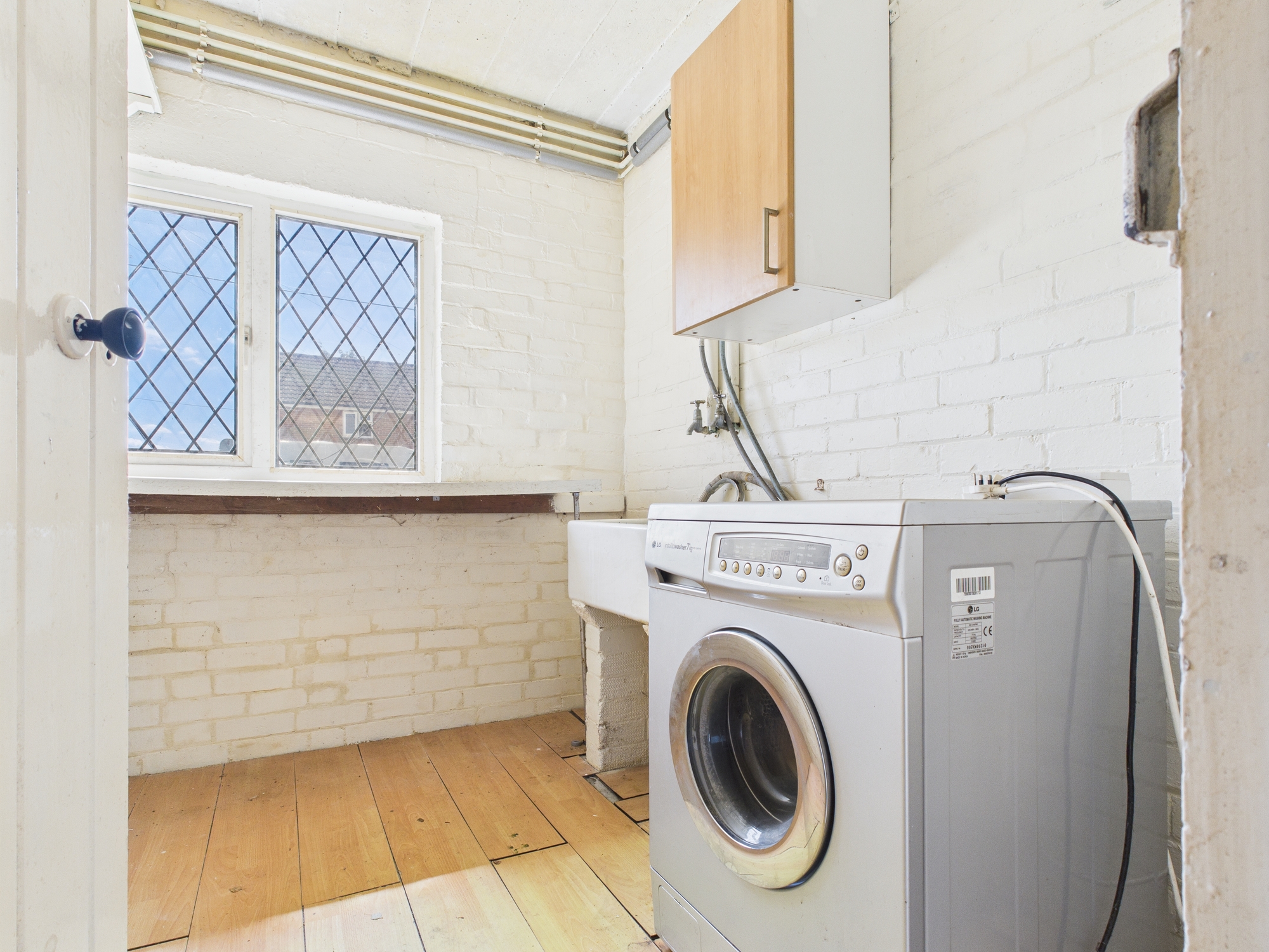 Window to front, butler sink, space for washing machine, laminate flooring.