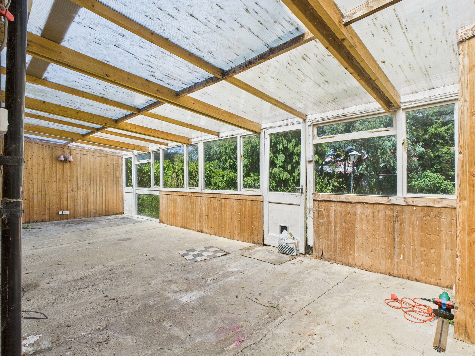 Wooden structure with polycarbonate roofing and concrete flooring, wall mounted double panel radiator, access to rear garden.