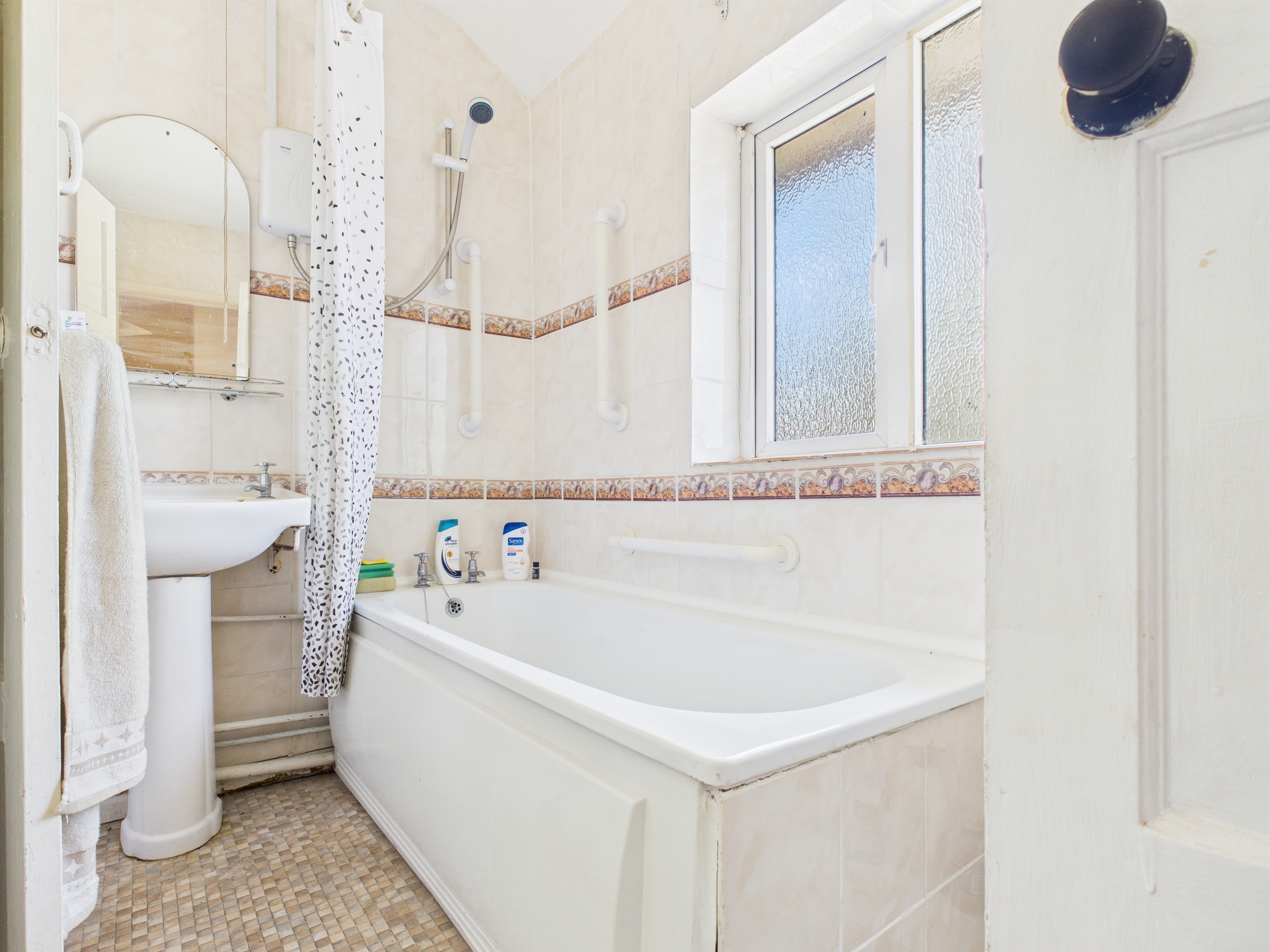 Window to rear, panelled bath with shower over, w.c., pedestal handwash basin, lino style flooring, electric wall heater, tiled walls.