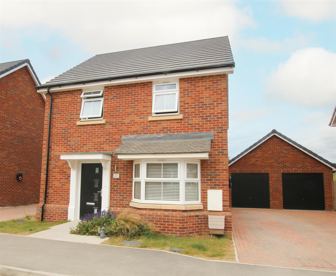 Paved pathway leading to front door with storm porch. Lawned areas either side with shrub planting. Block paved driveway leading to garage. EV charging point.