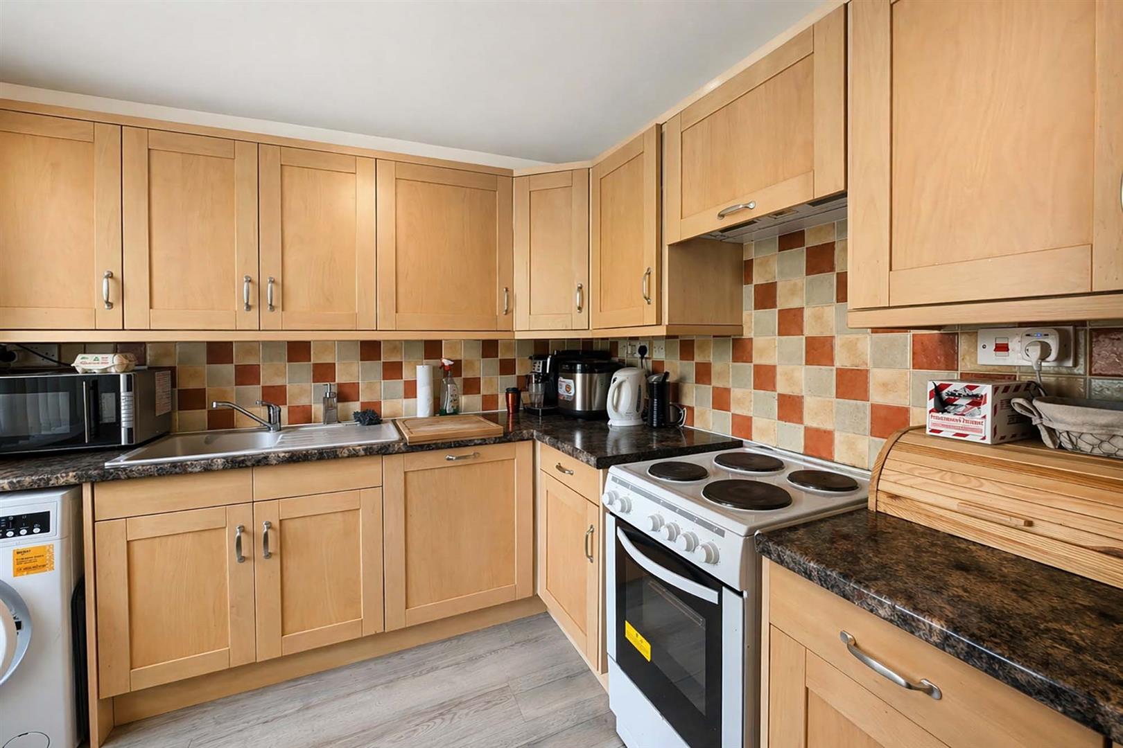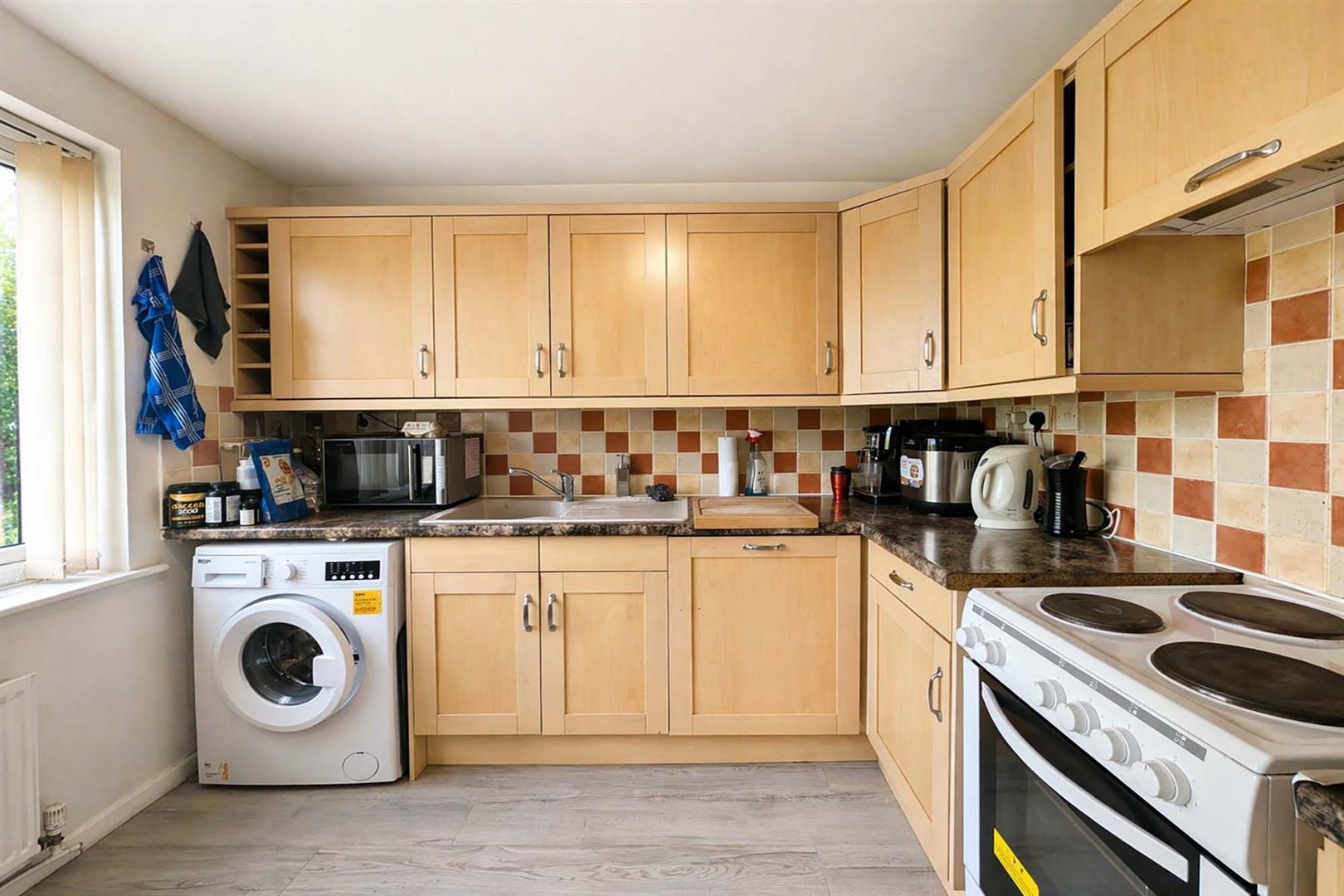 Fitted with a range of eye level and base storage units with granite style work top surfaces over, fully tiled splash backs, inset white sink unit with mixer tap over, space for cooker, integrated dishwasher, space and plumbing for washing machine, space for fridge/freezer, double glazed window to the front aspect.