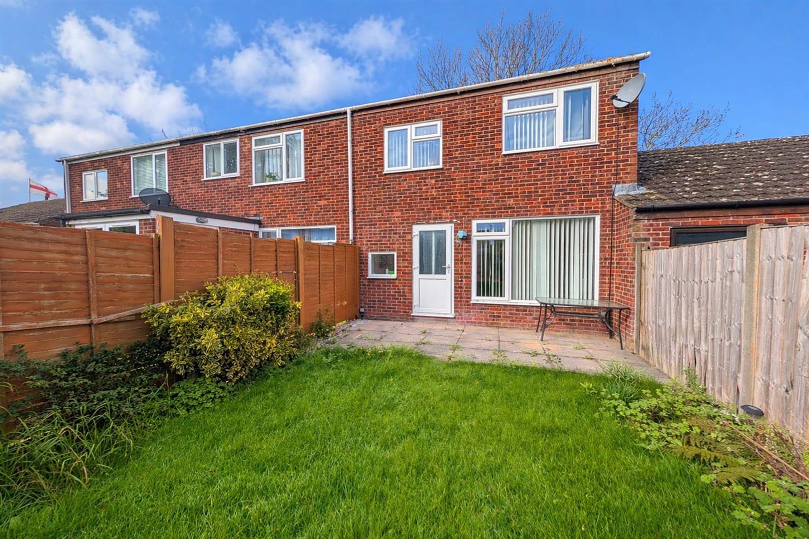 Fully enclosed rear garden predominantly laid to lawn with a small easy care border, patio area and timber shed.