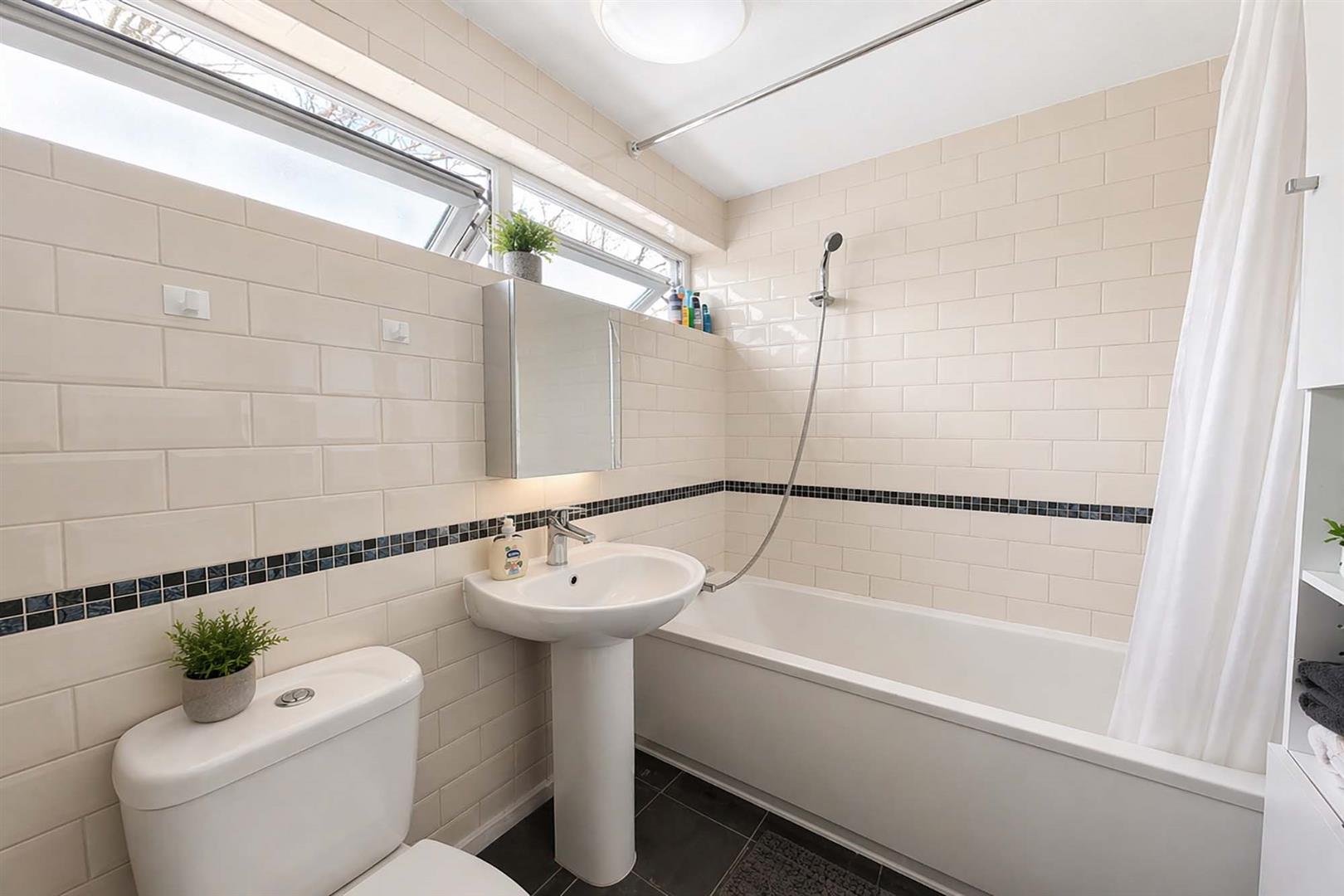 Suite comprising panel bath, with mixer tap shower over, pedestal wash hand basin, low level WC, fully tiles throughout, heated towel rail, high level double glazed window to the front aspect.