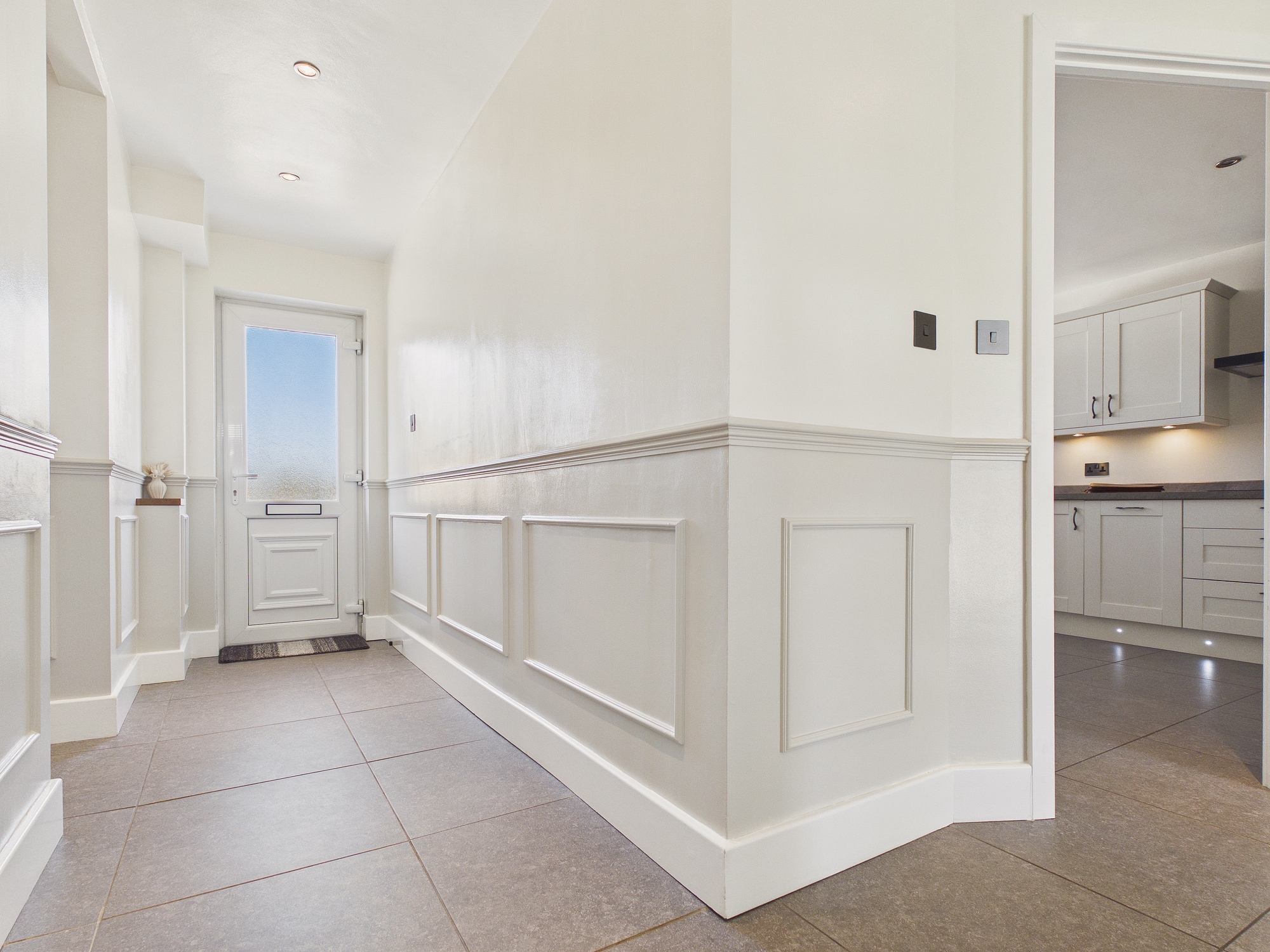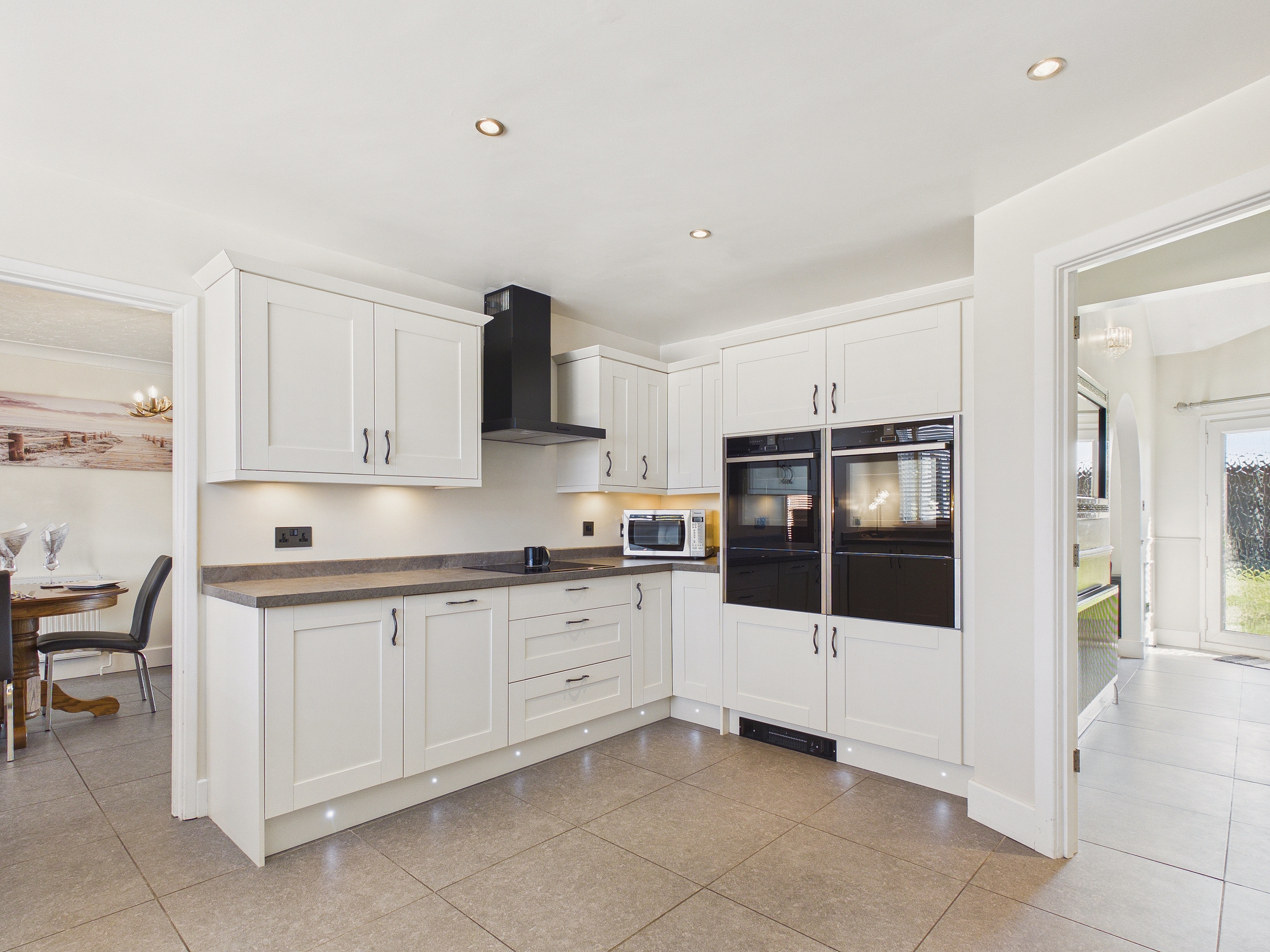 uPVC double glazed window to rear, wall and base units under square edge worksurfaces, 1 1/2 sink drainer with mixer tap over, 4 ring “Neff” induction hob inset to worksurface with extractor over, eye level double ovens with hide and slide doors, space for American style fridge/freezer, 2 x integral dishwashers, tiled flooring, ceiling spotlights and floor lighting, opening to entrance hall.