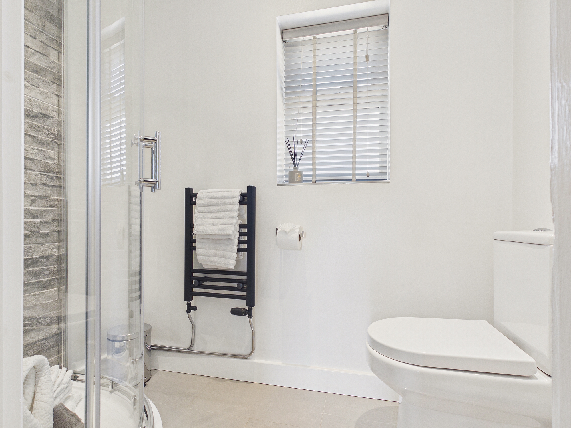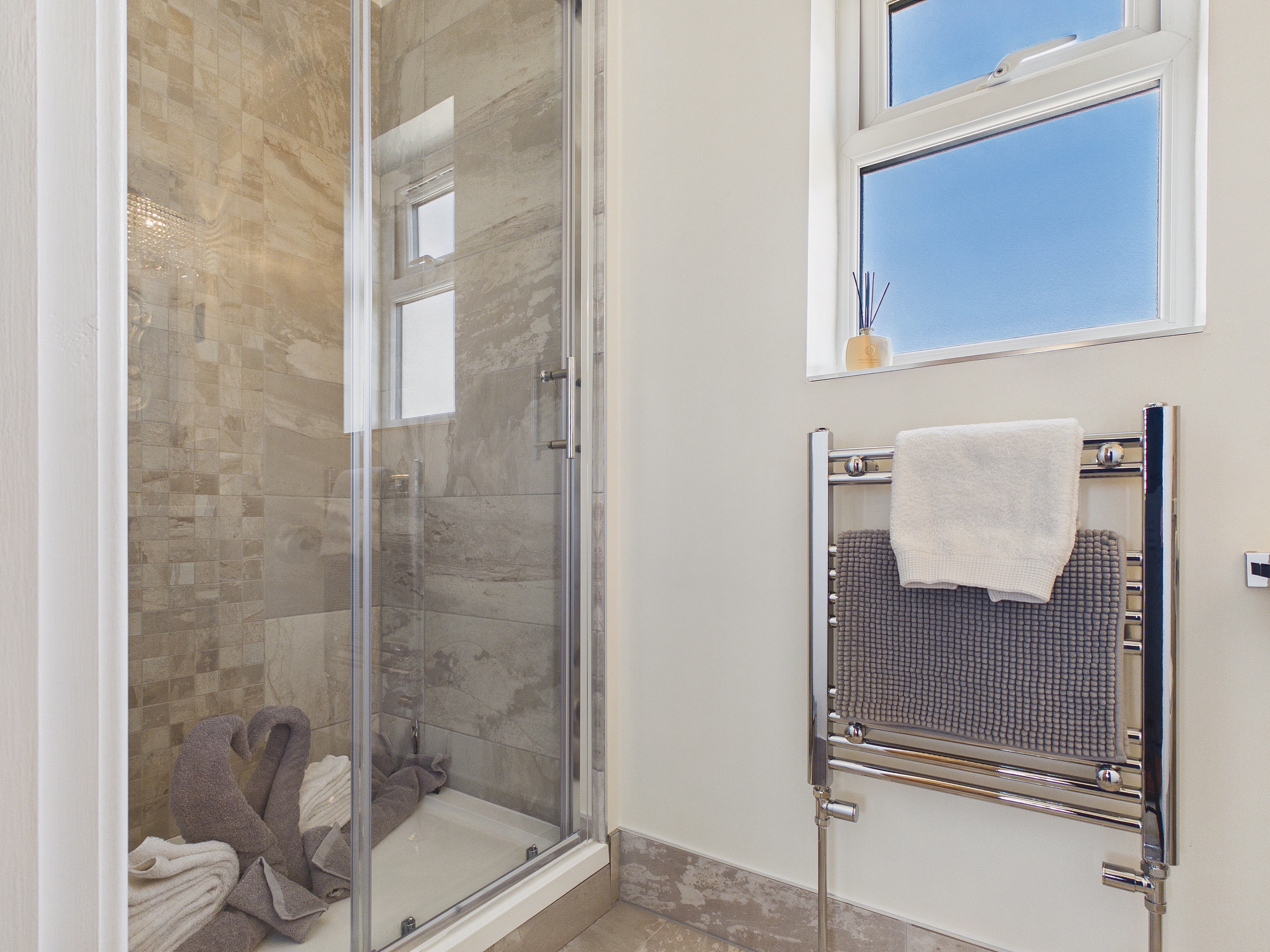 uPVC double glazed window to rear, wall mounted heated towel rail, corner shower cubicle, w.c., handwash basin inset to vanity unit, tiled flooring, extractor, ceiling spotlights.