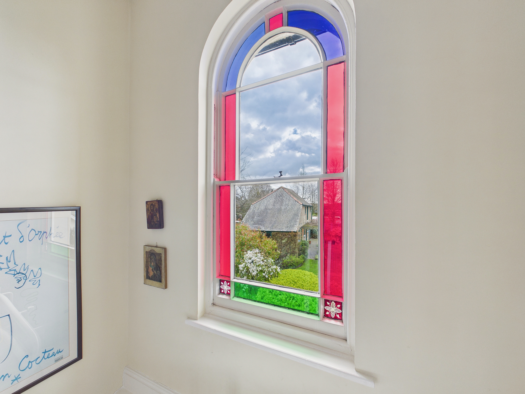 Sash window to the front and additional stained glass sash window to the side (both with secondary glazing), double panel radiator.