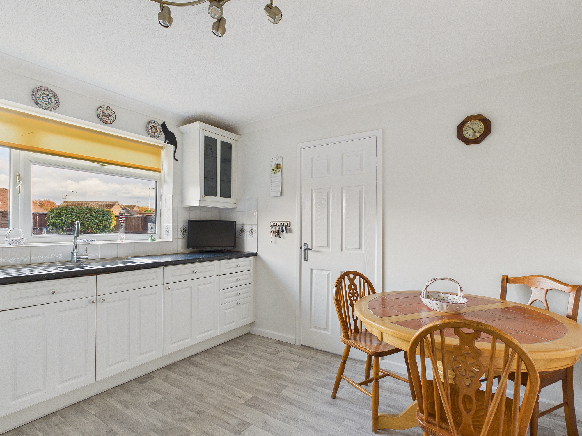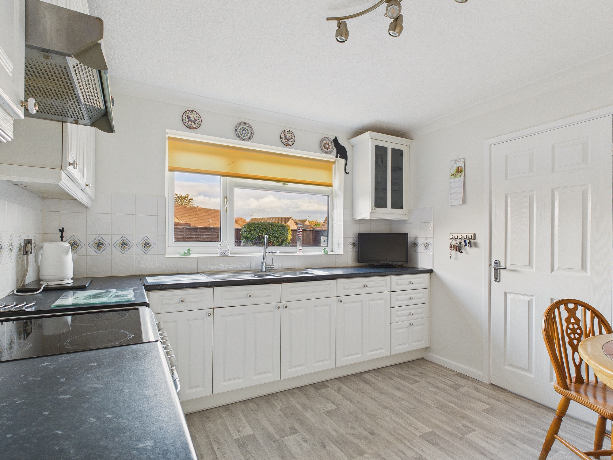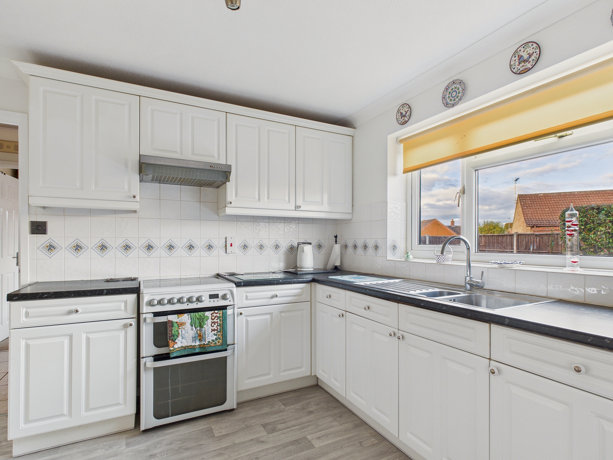 11'0" x 10'5" (3.36m x 3.18m) UPVC double glazed window to the rear aspect, fitted with a range of wall and base units under worksurfaces, stainless steel 1 1/2 bowl sink unit and drainer, space for double oven, vinyl flooring, radiator.