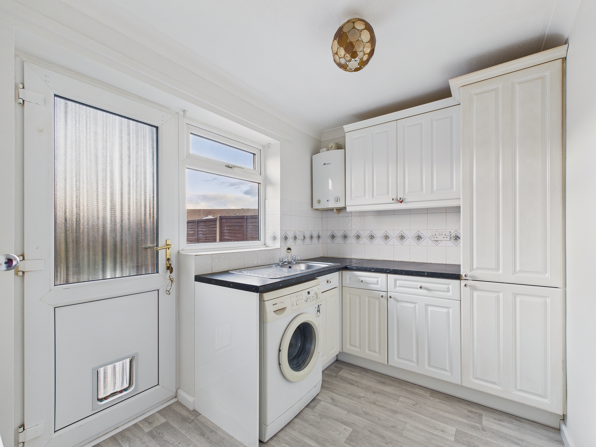 8'10" x 6'6" (2.70m x 1.98m) Fitted with a range of wall and base units, with sink inset, space for washing machine, gas central heating boiler, radiator, door to rear garden.