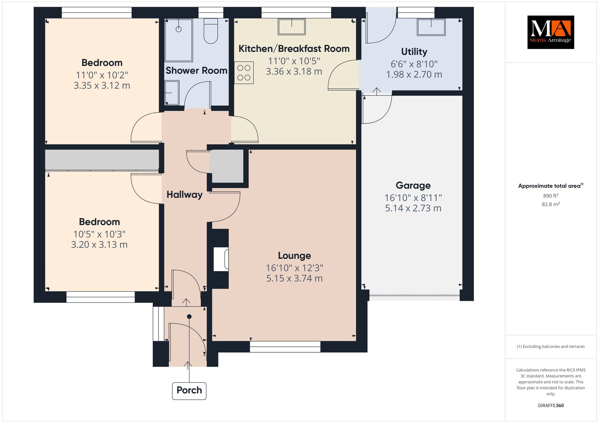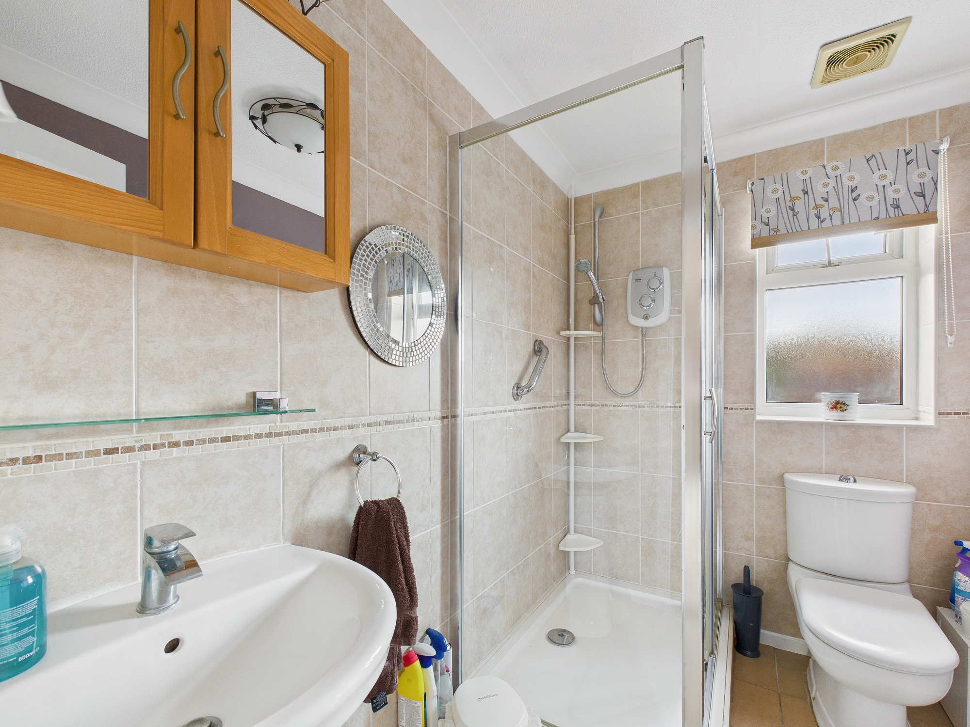 UPVC double glazed window to the rear aspect, shower cubicle with electric shower, pedestal handbasin, w.c., heated towel rail, tiling to walls and floors.