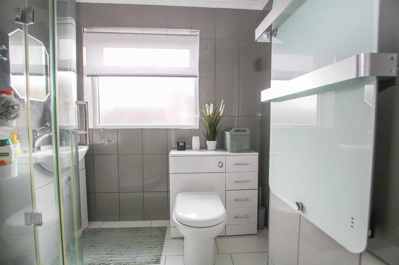 Fitted with a back to wall and storage WC, hand basin and vanity unit. Quadrant Shower Enclosure. Obscured window to side aspect. Heated towel rail.