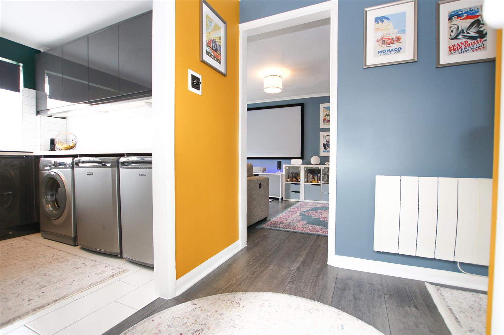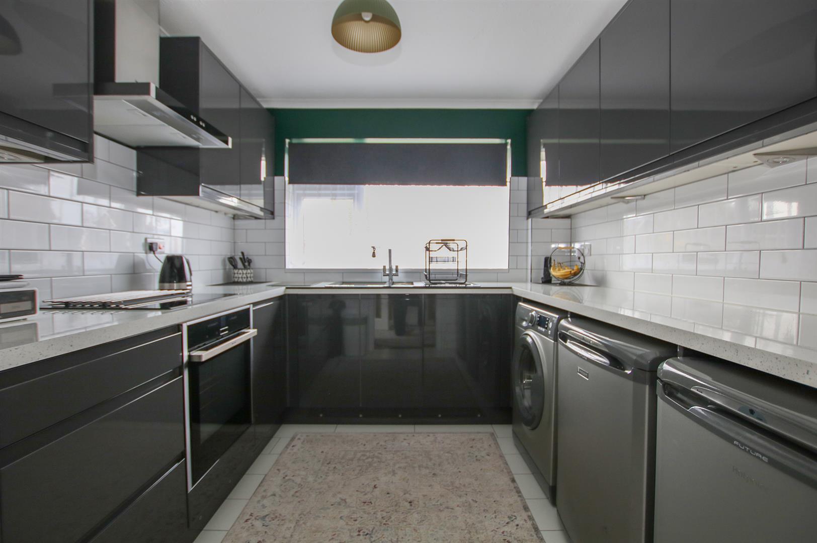 A modern well equipped kitchen fitted with a range of eye and base level storage units with work surfaces over. Sink and drainer with mixer tap over. Tiled splashbacks. Integrated oven, with electric induction hob and extractor over. Space and plumbing for washing machine. Space for under counter fridge and freezer. Window to front aspect.