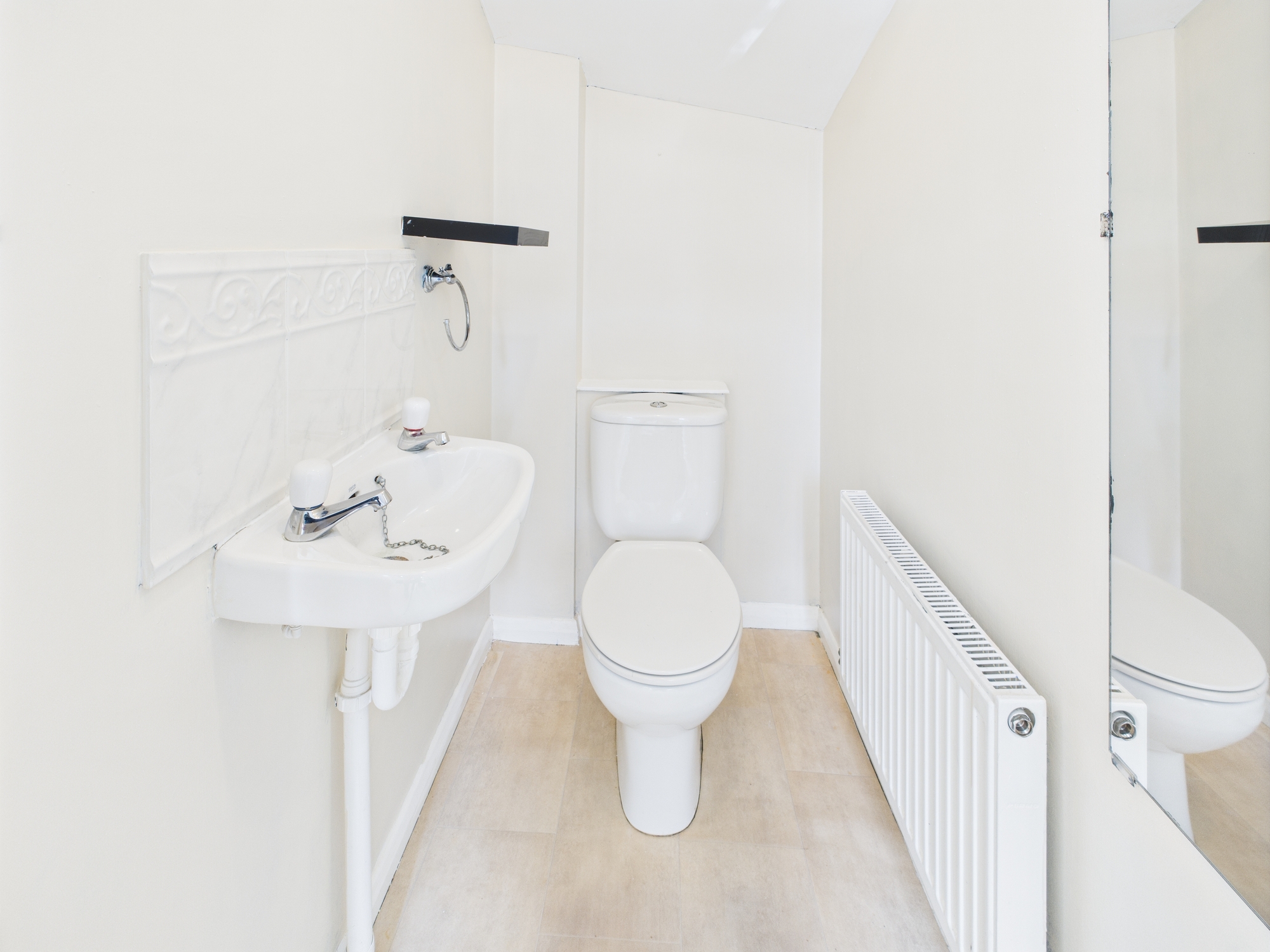 Low level w.c., handwash basin, wall mounted radiator.