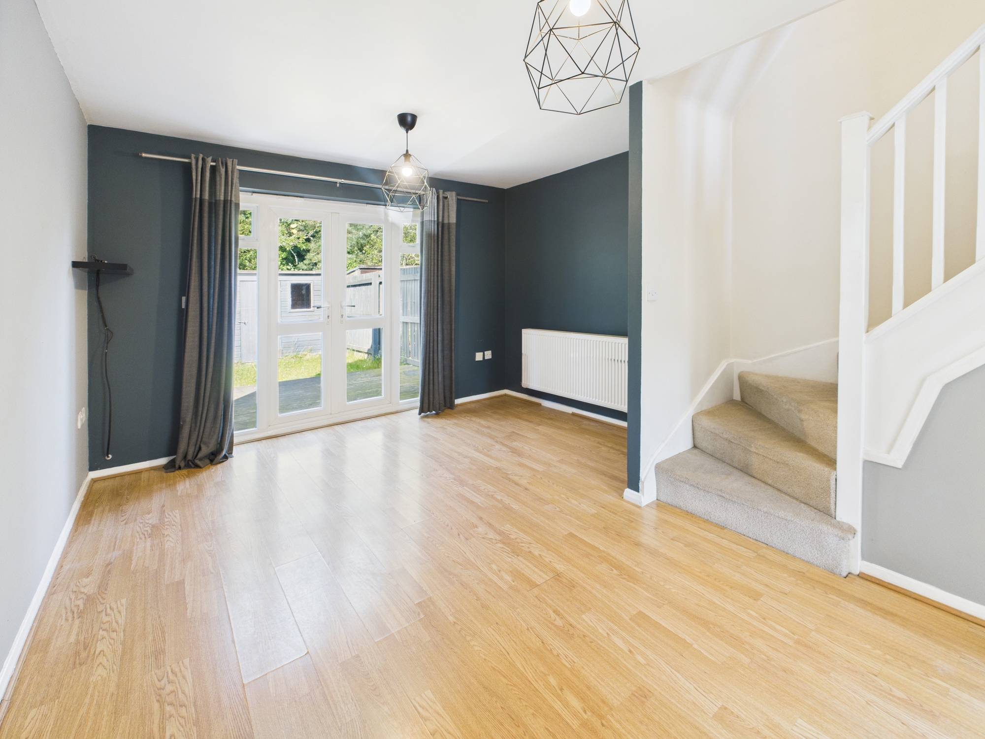 Wall mounted radiator, uPVC double glazed French doors to the garden, stairs to first floor.