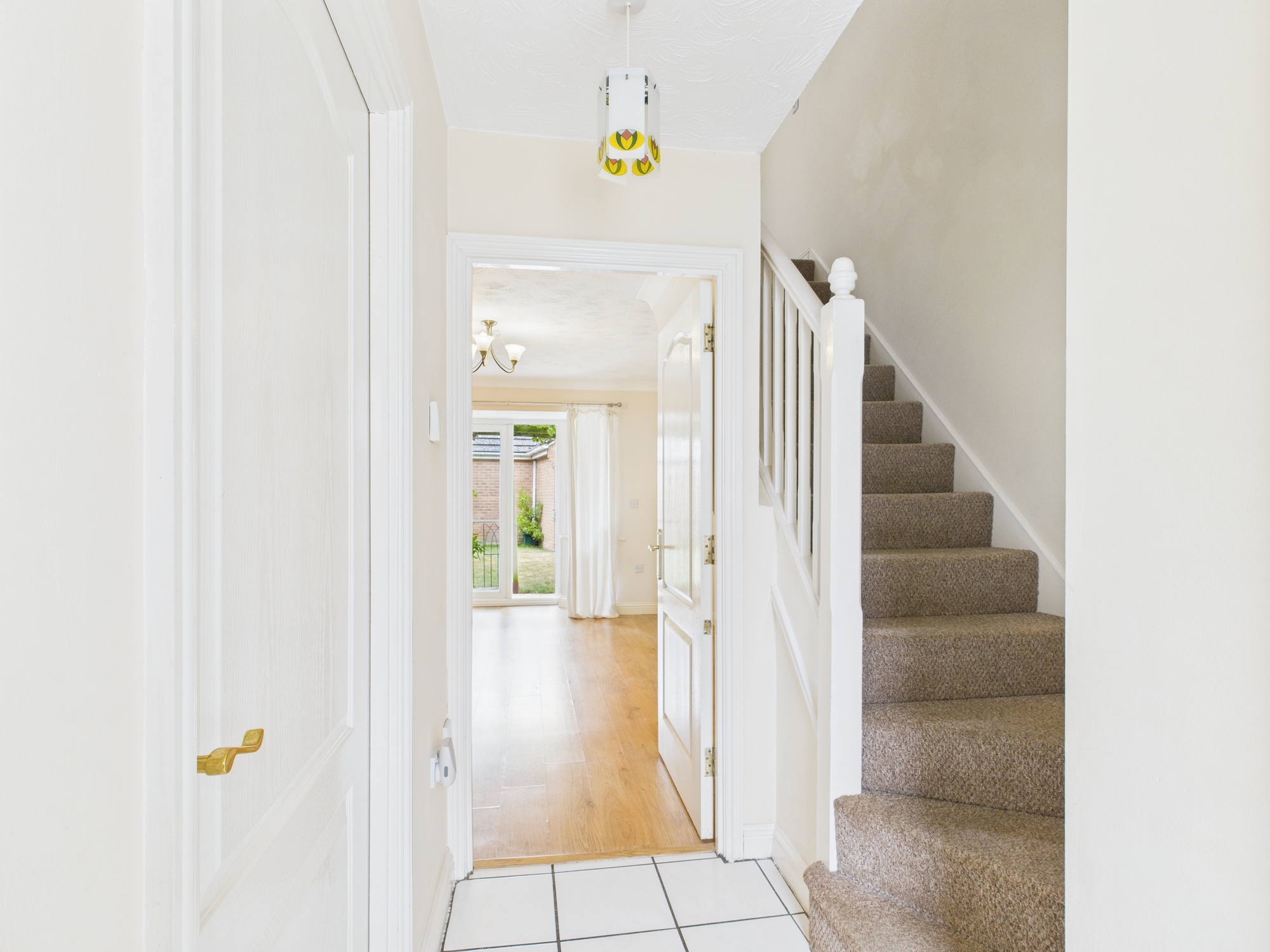 Textured ceiling, wall mounted radiator, smoke alarm, door to storage cupboard, stairs to second floor, doors to all rooms.