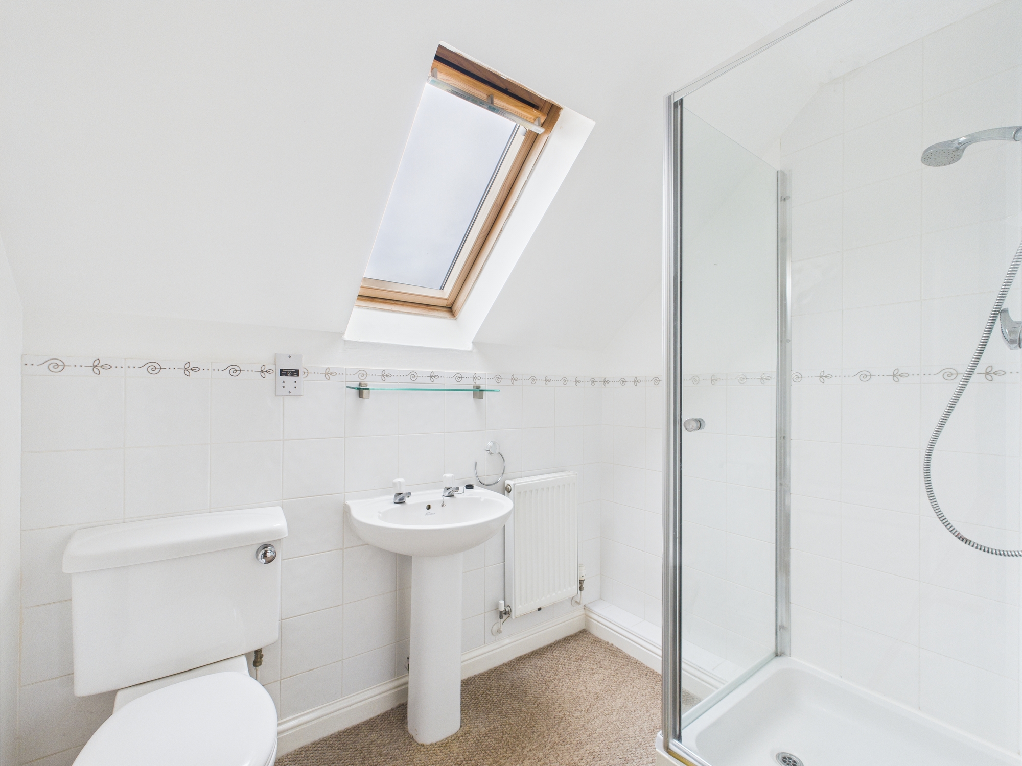Velux roof light to rear, fully tiled shower cubicle with wall mounted shower, close coupled WC, pedestal hand wash basin, part tiled walls, shaver point, radiator.