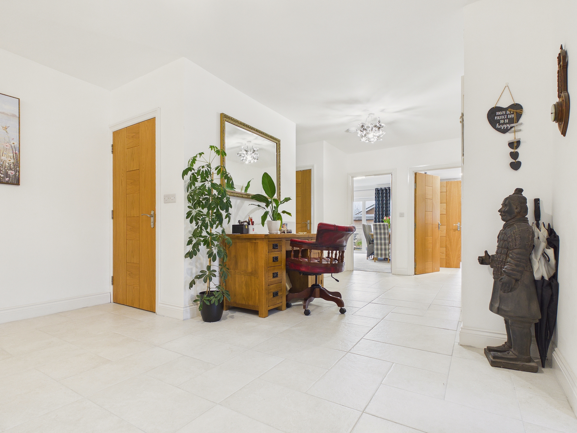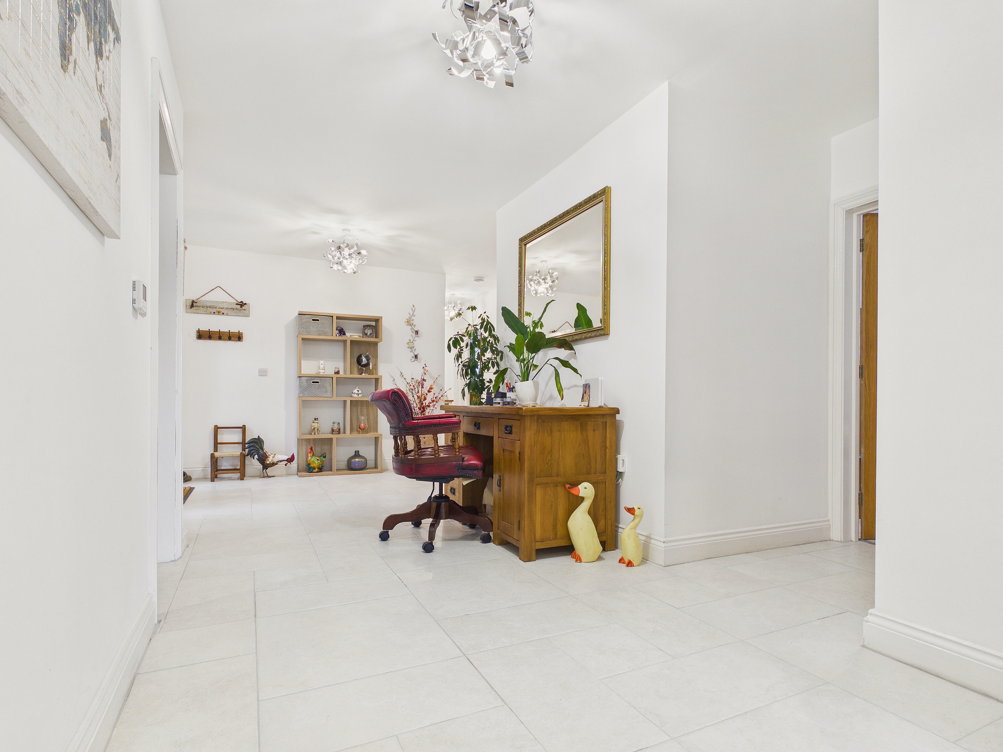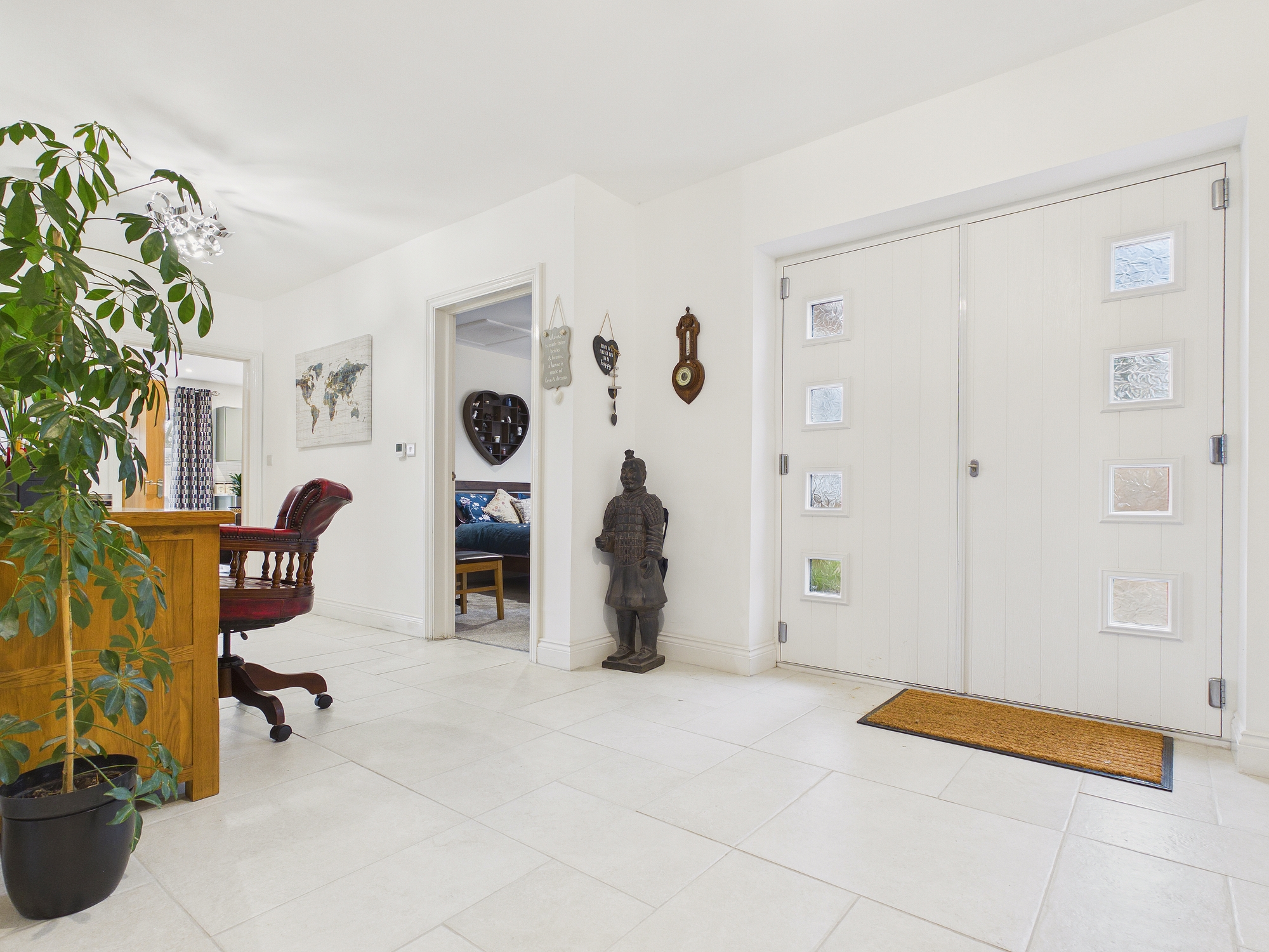 Tiled floor with underfloor heating, door to storage cupboard, doors to all rooms.