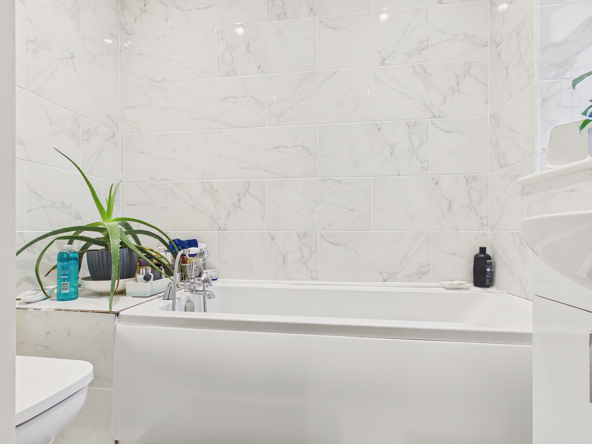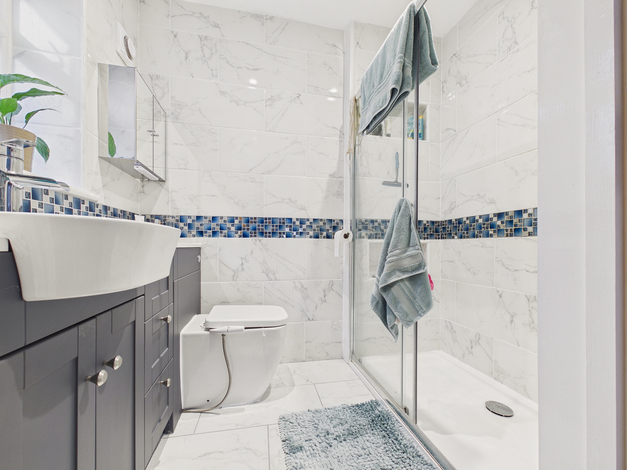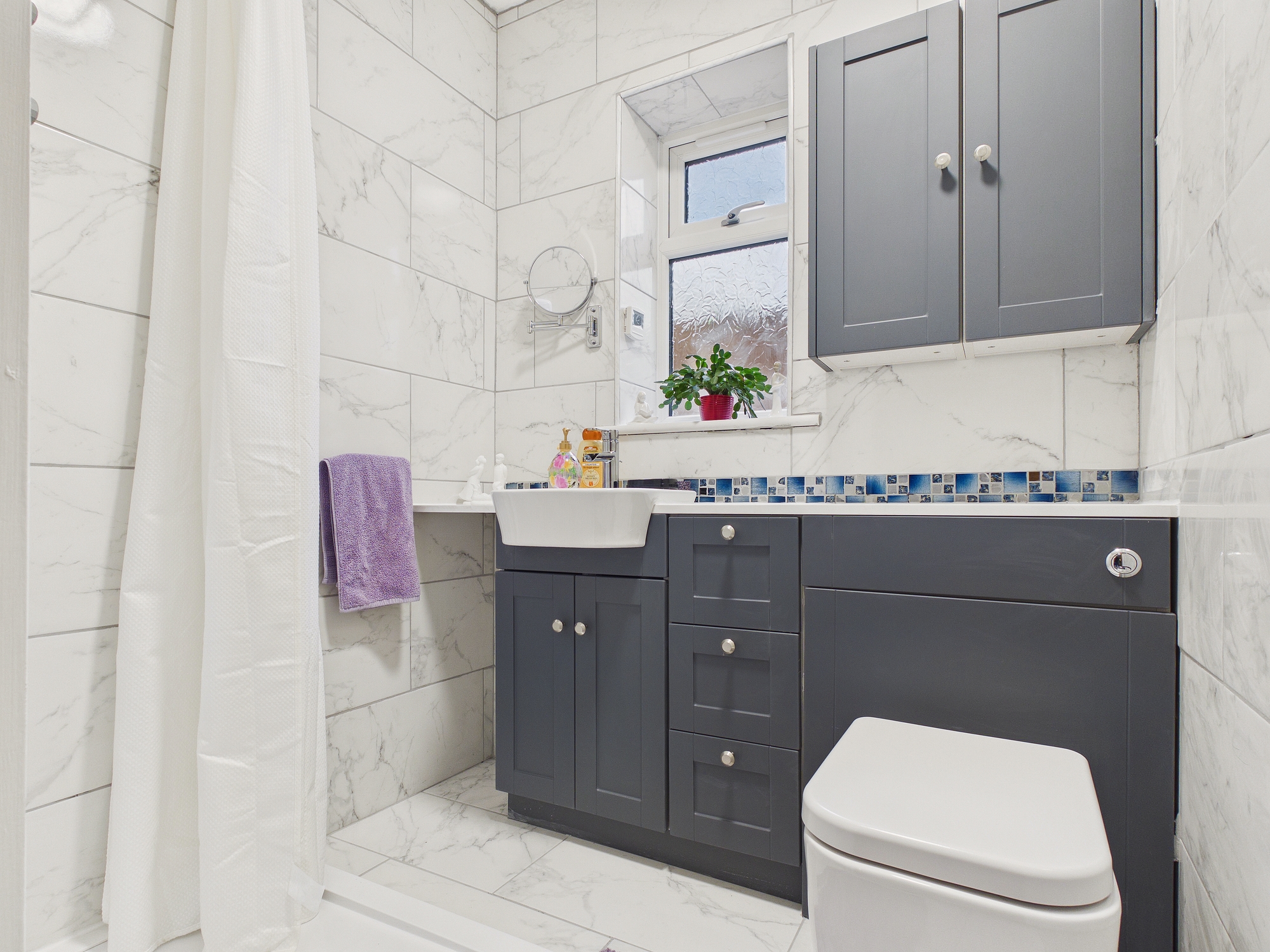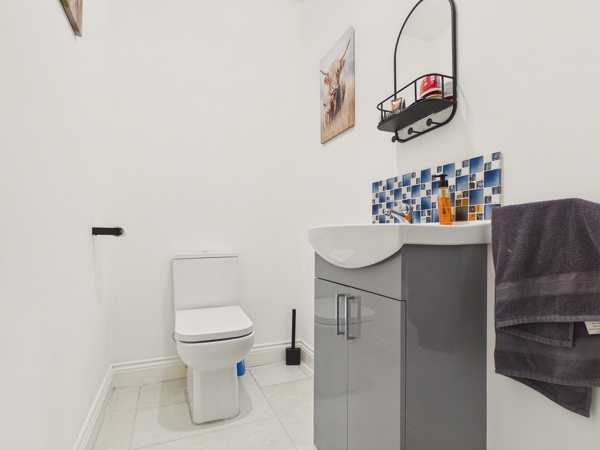 Tiled under floor heating, w.c., handwash basin inset to vanity unit, extractor.