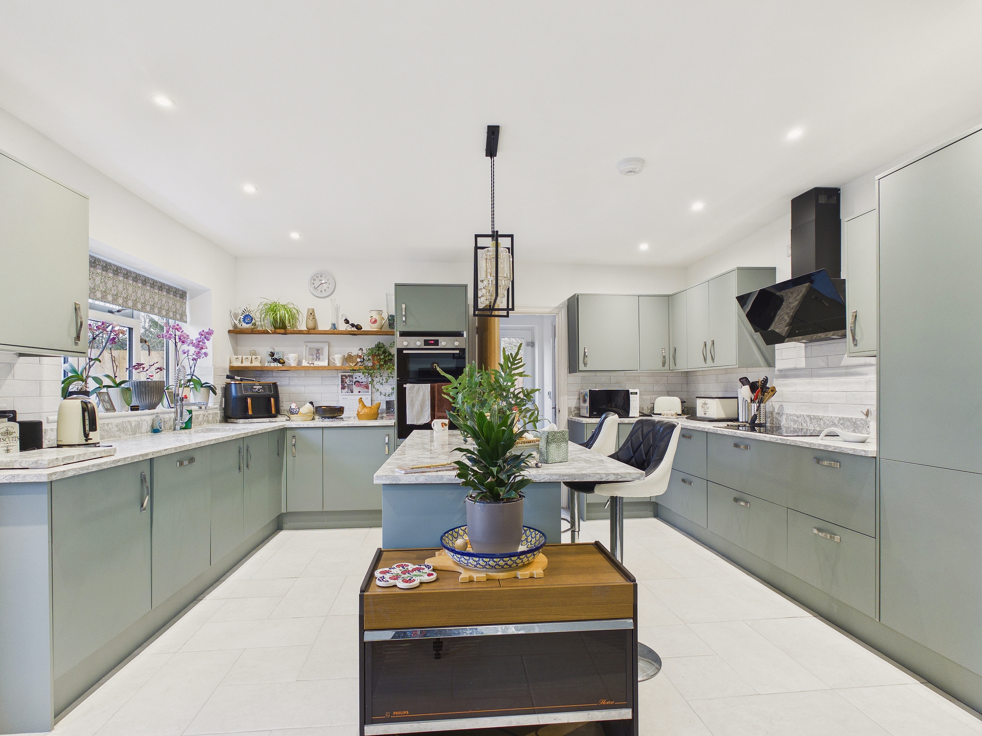 uPVC double glazed window to rear, uPVC double glazed French doors to rear, wall and base units under quartz worksurfaces with centre island/breakfast bar, sink drainer inset to worksurface with mixer tap over, 5 ring Bosch double oven, integral dishwasher, integral full height fridge and freezer, tiled under floor heating, ceiling spotlights, door to:-