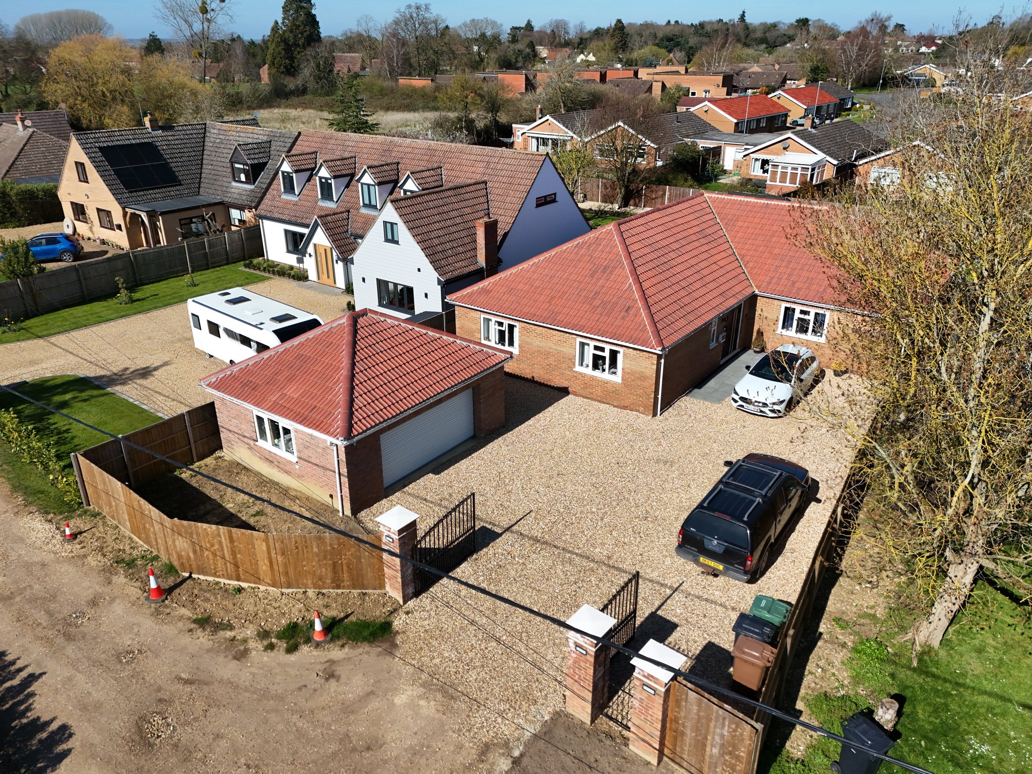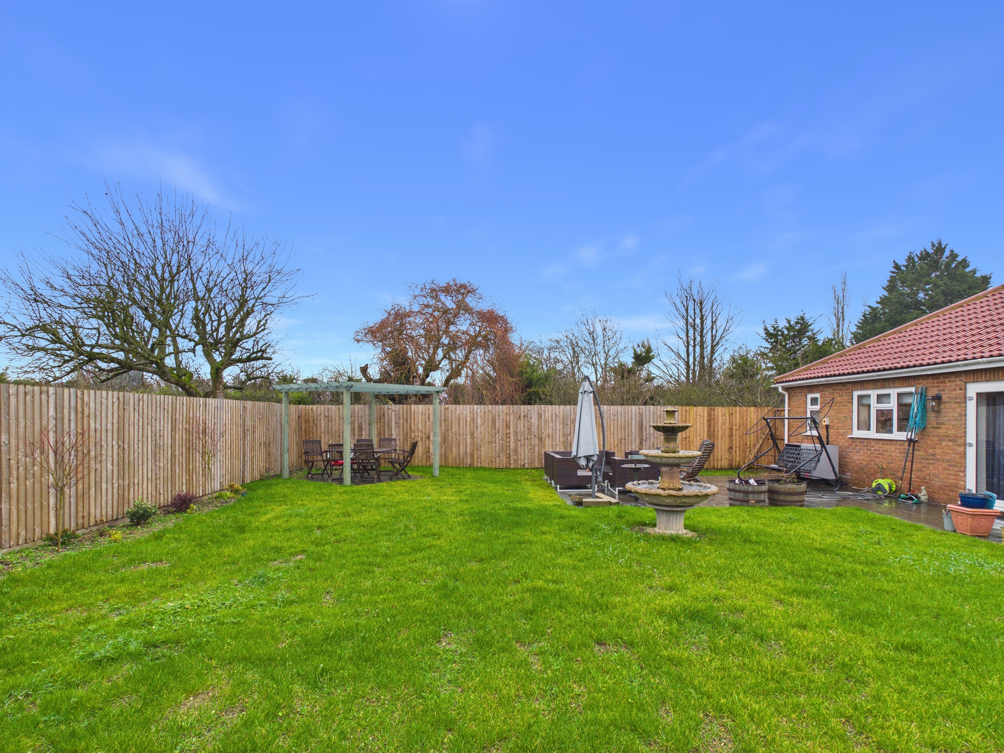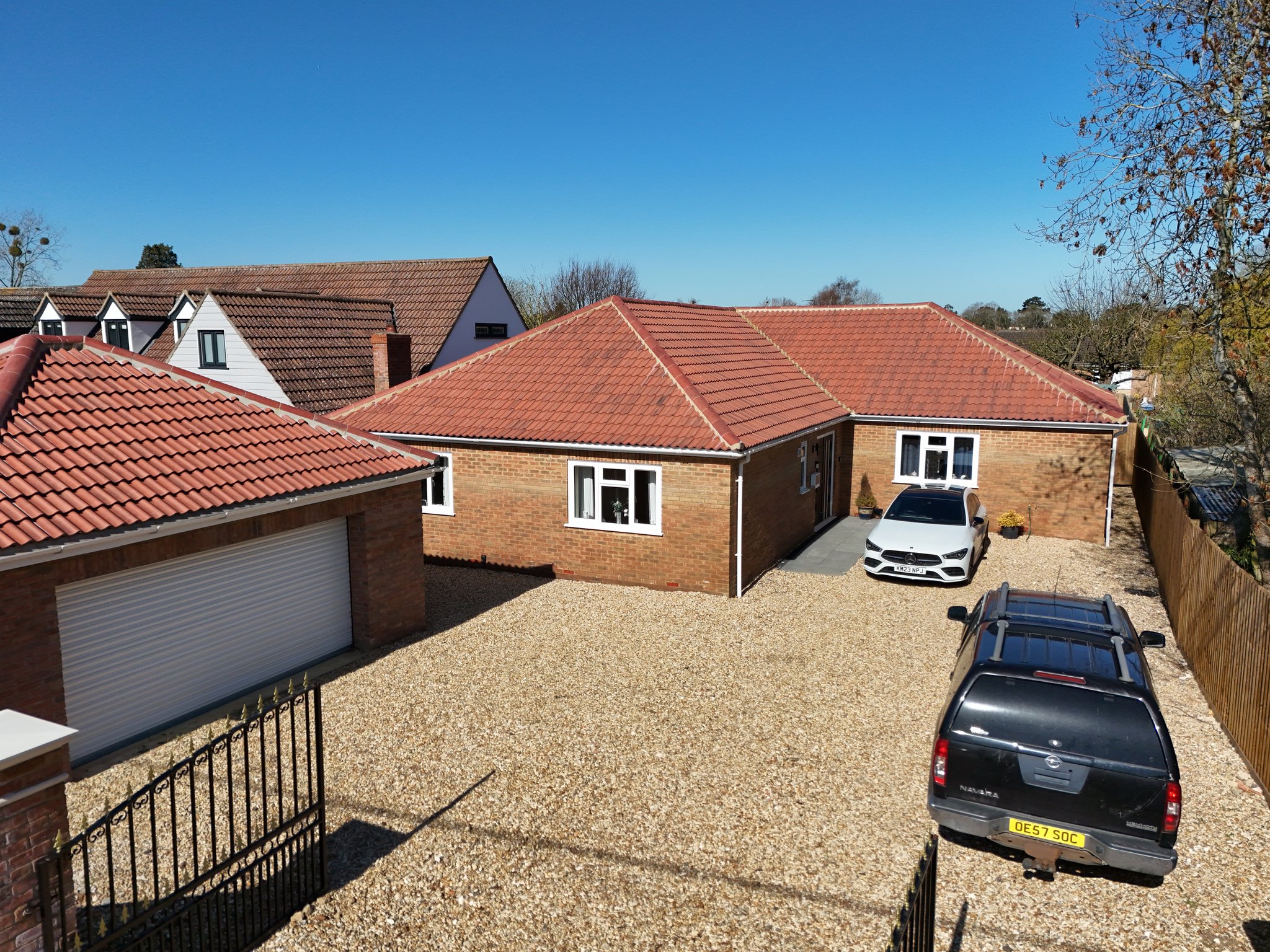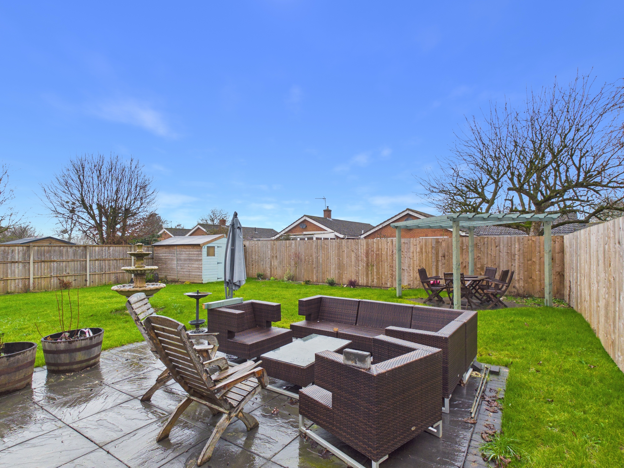 The front property has metal double opening gates leading to the shingle driveway providing off road parking and leads to the double garage. A pathway to the side leads through to the rear garden. Here it is mainly laid to lawn with a patio, wooden storage shed and pergola inset, all enclosed by fencing.