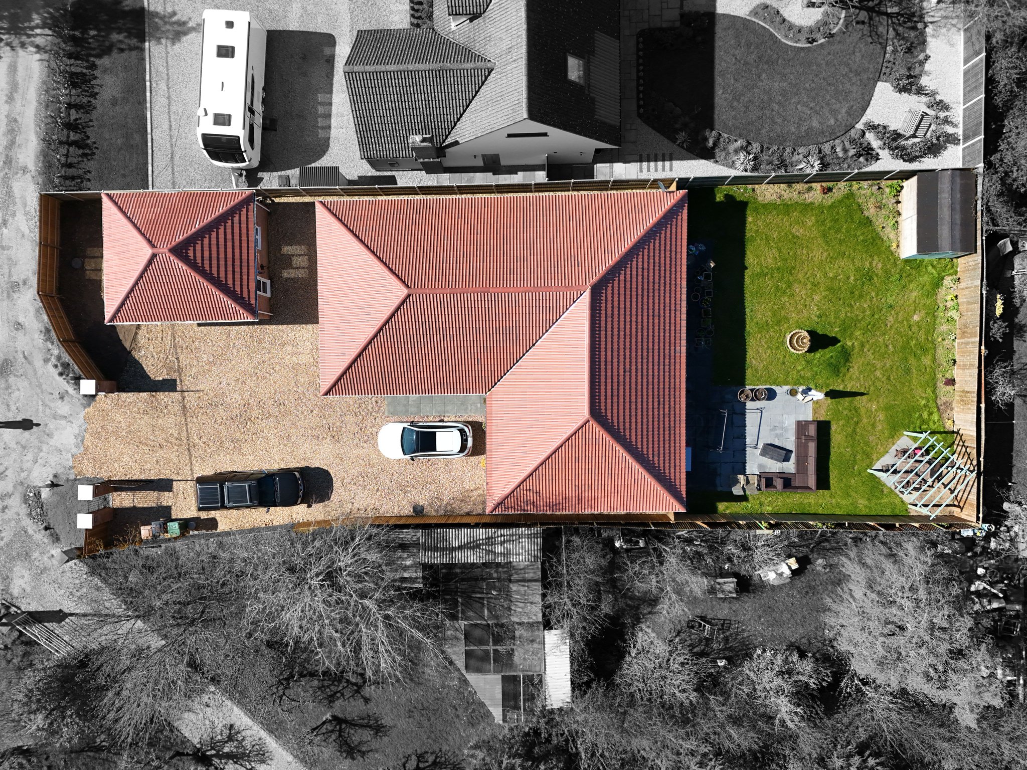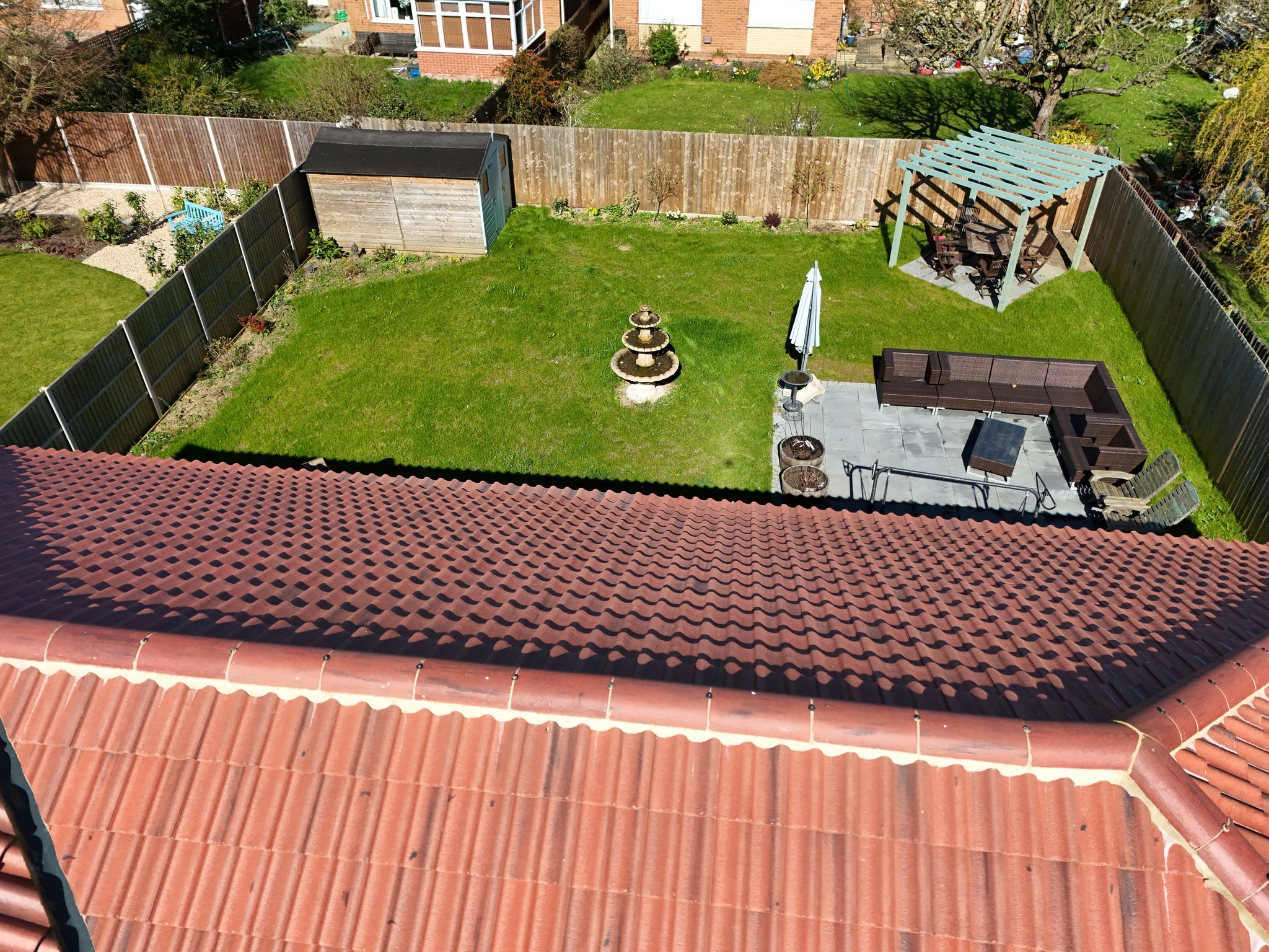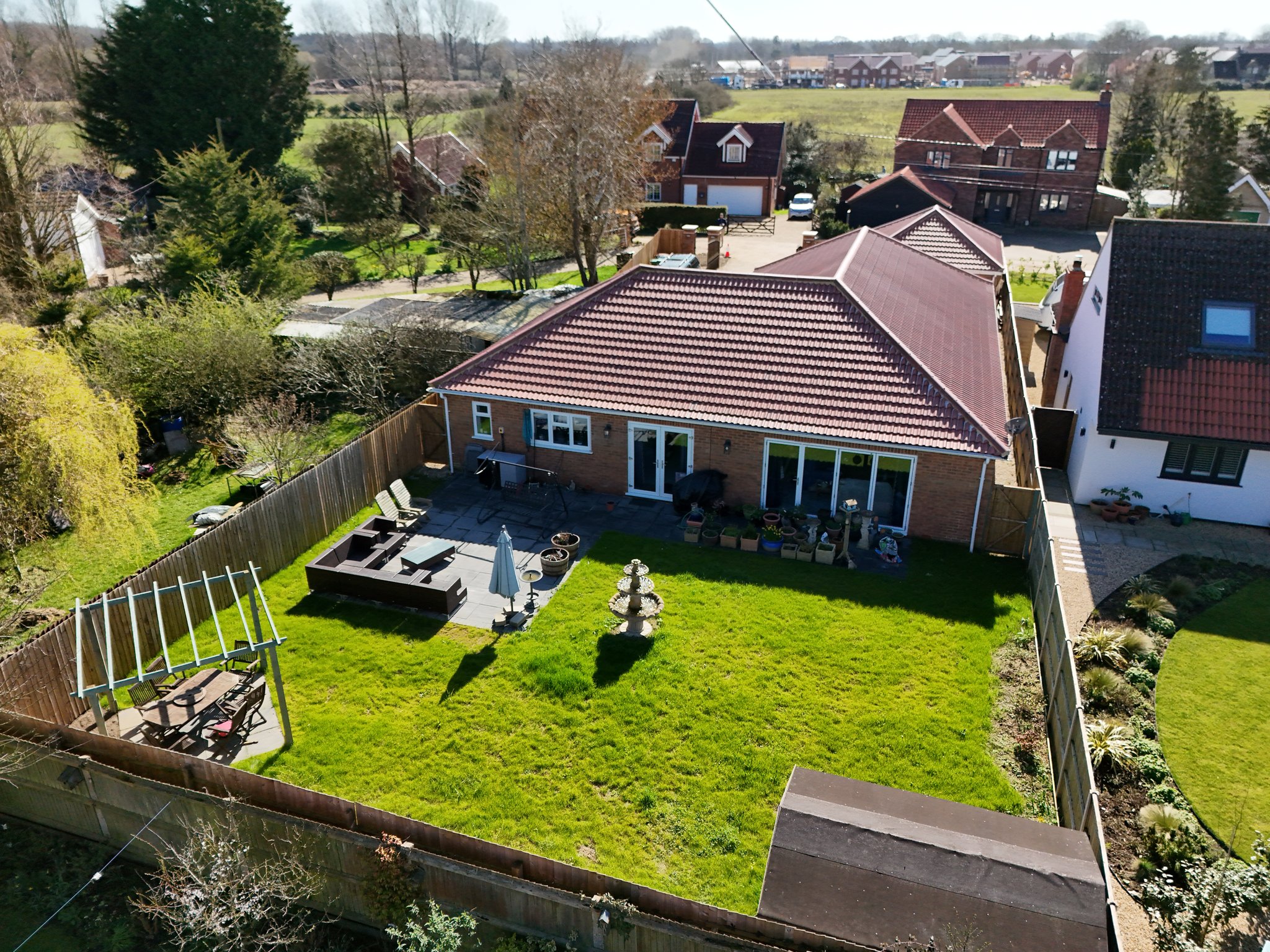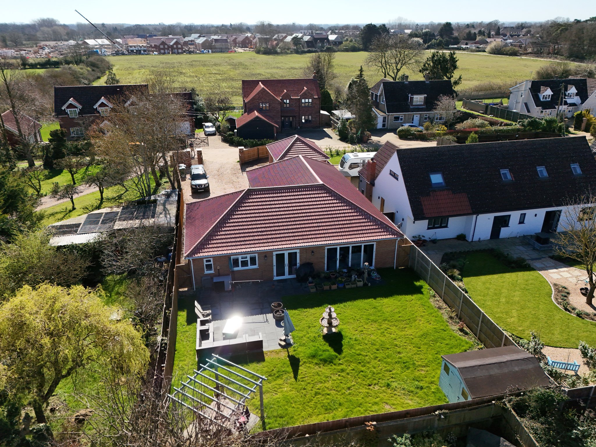 The front property has metal double opening gates leading to the shingle driveway providing off road parking and leads to the double garage. A pathway to the side leads through to the rear garden. Here it is mainly laid to lawn with a patio, wooden storage shed and pergola inset, all enclosed by fencing.