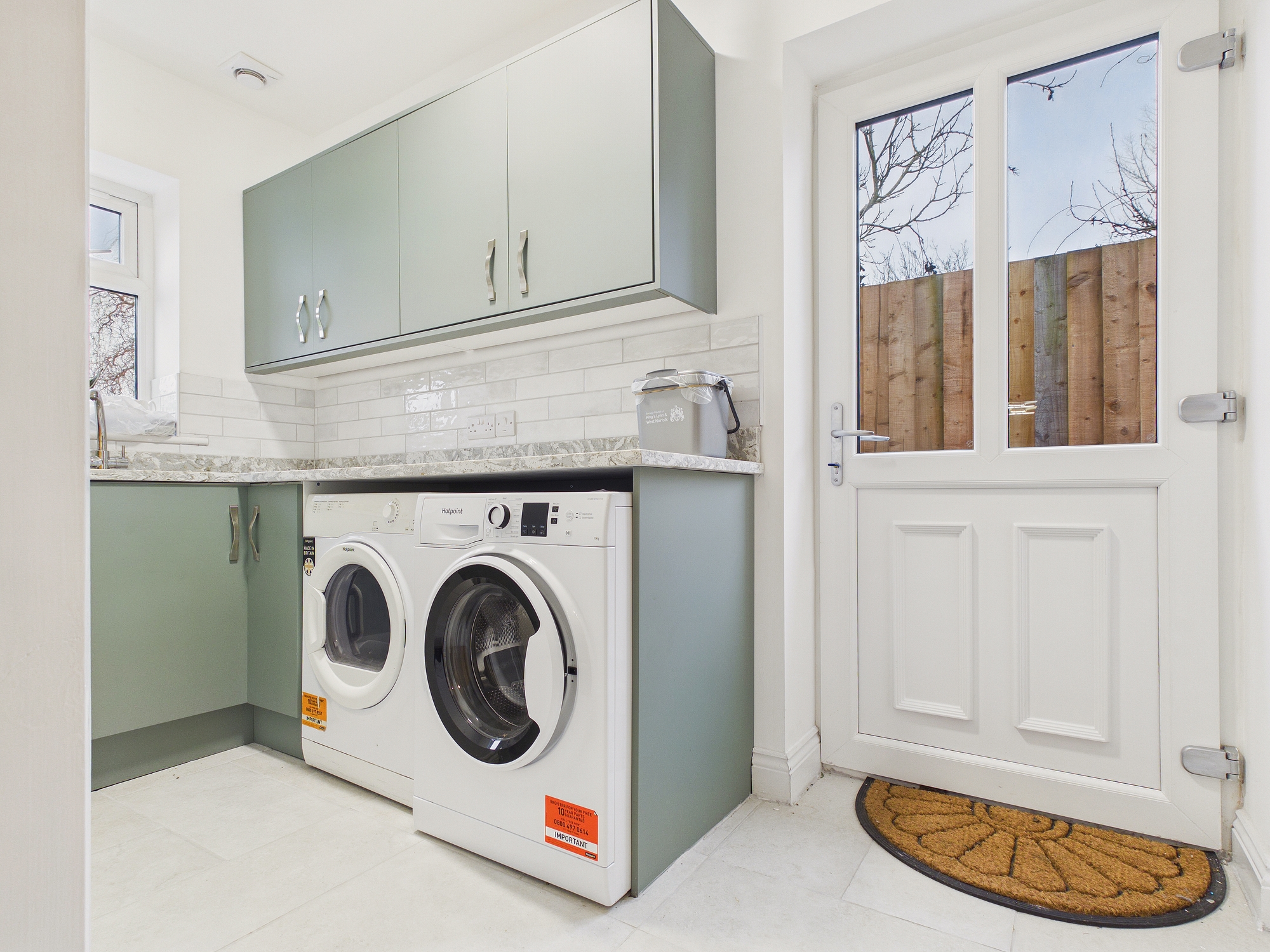 uPVC double glazed window to rear, uPVC double glazed door to side, wall and base units under quartz worksurface with inset sink and mixer tap over, spaces for washing machine and tumble drier, tiled under floor heating, extractor, door to airing cupboard housing air source central heating boiler.