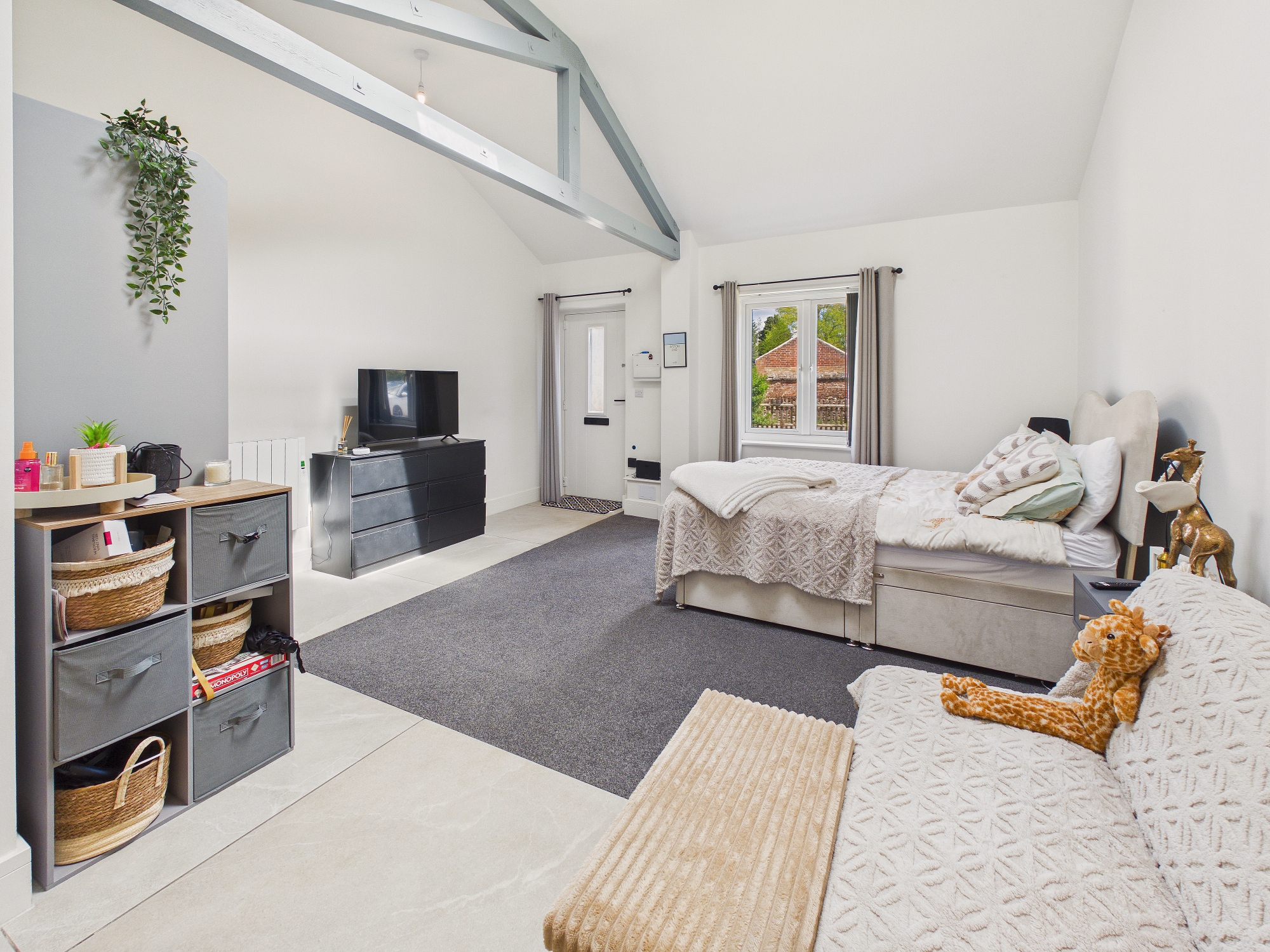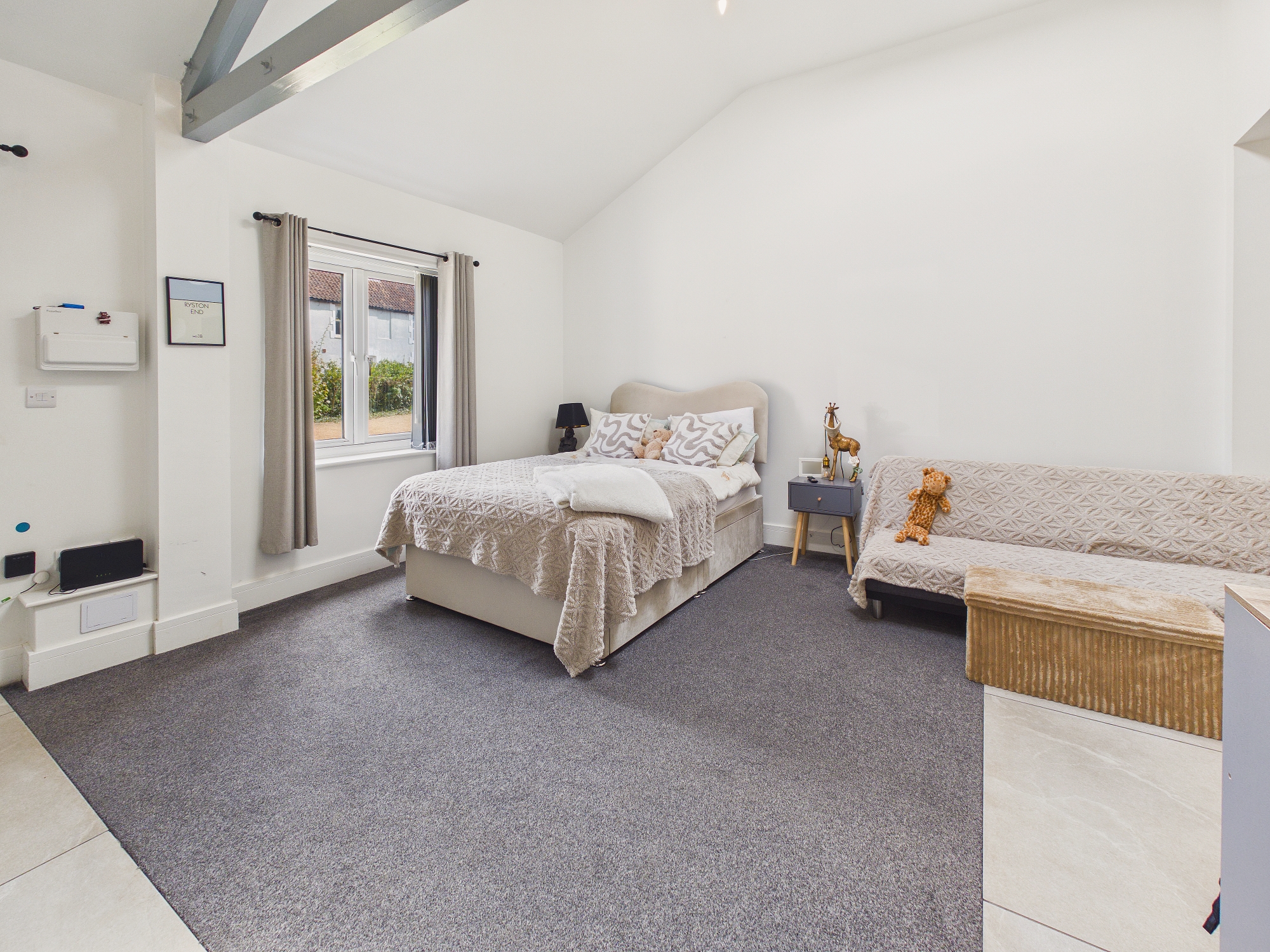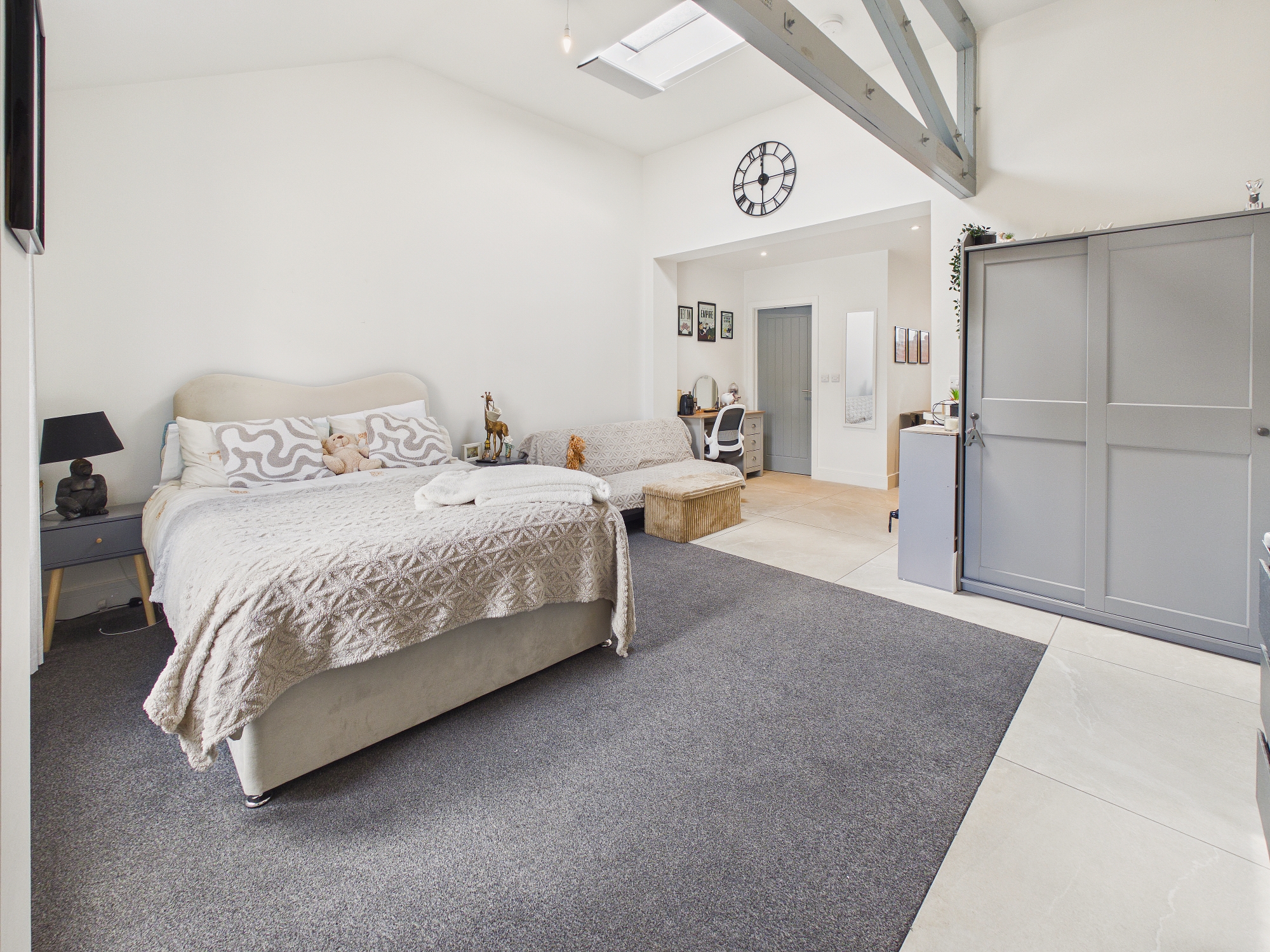uPVC double glazed window to front, wall mounted electric heater, partially carpeted with tiled surround, ceiling skylight, exposed beam to ceiling, opening through to:-
