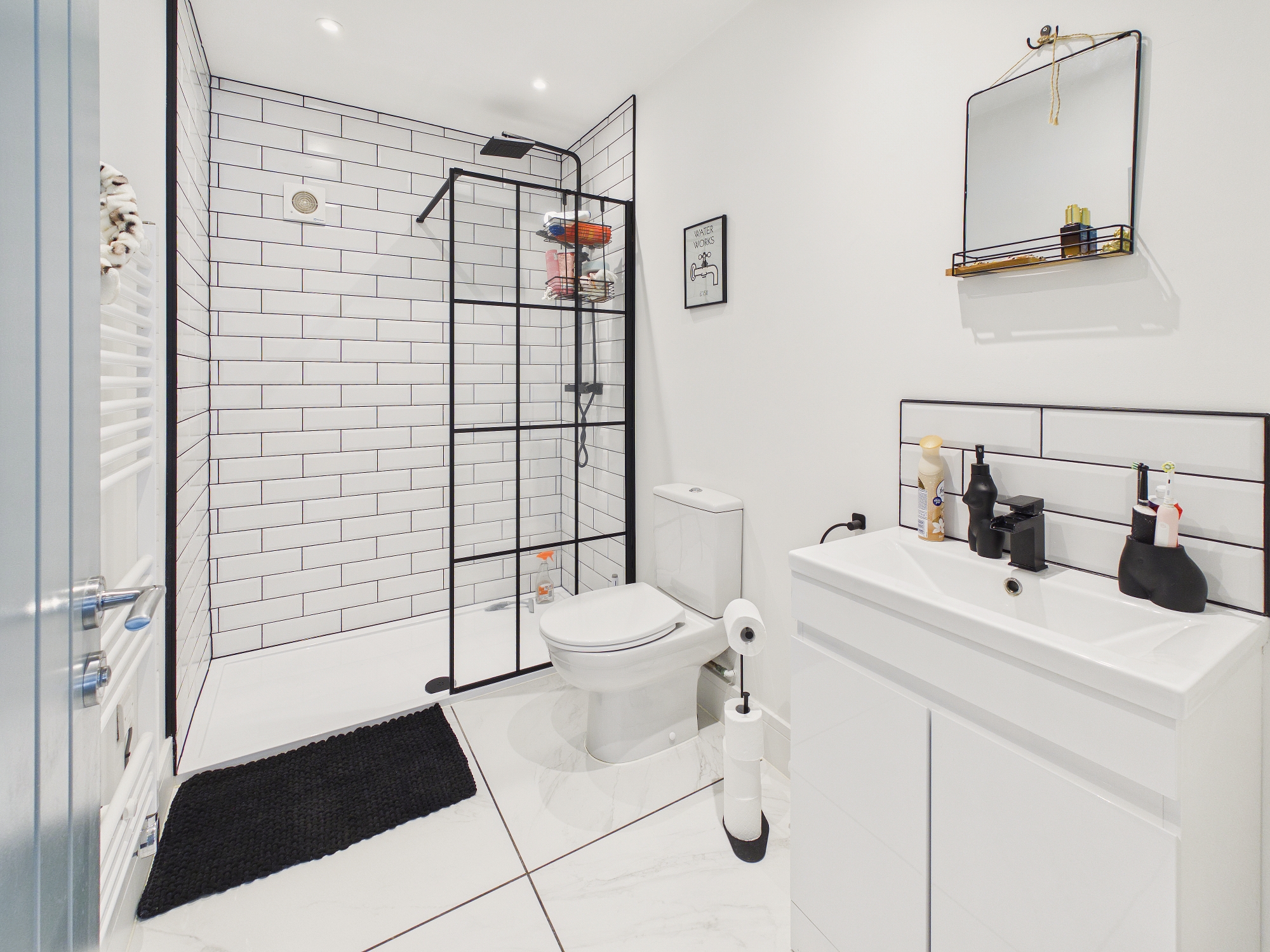 Wall mounted heated towel rail, walk in shower cubicle with glass screen, w.c. handwash basin inset to vanity unit, tiled flooring, extractor, ceiling spotlights.