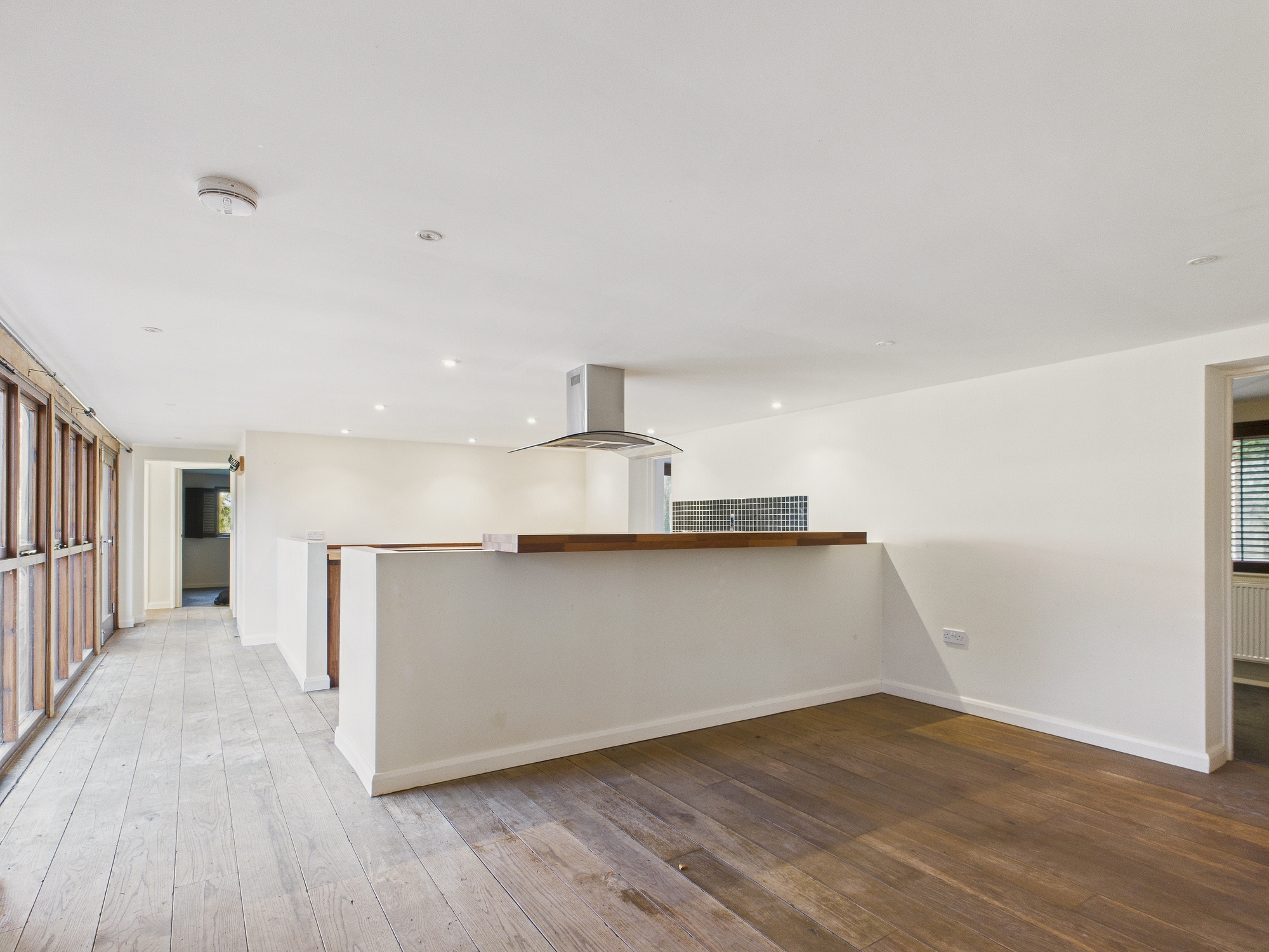 Spanning along the side of the property with double glazed floor to ceiling glass that overlooks the courtyard. The corridor round to both sides with wooden flooring accessing both the dining room and bedroom but is largely open plan to:-