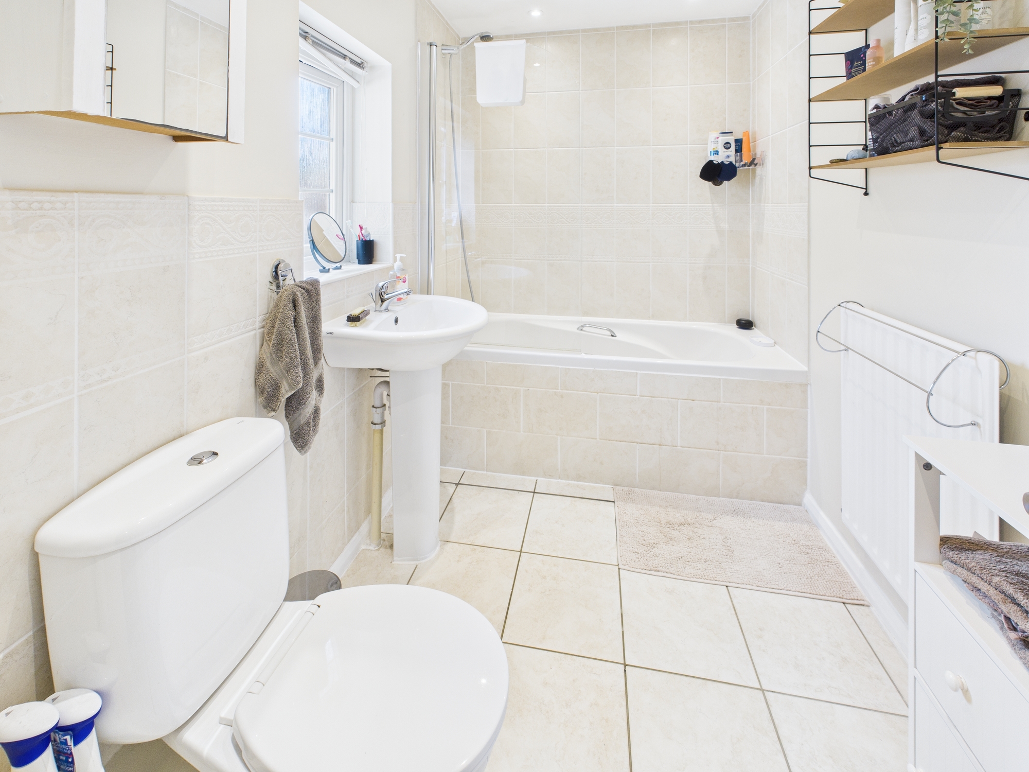 Tiled bath, low level w.c., handwash basin, extractor fan, wall mounted radiator, uPVC double glazed window to side.