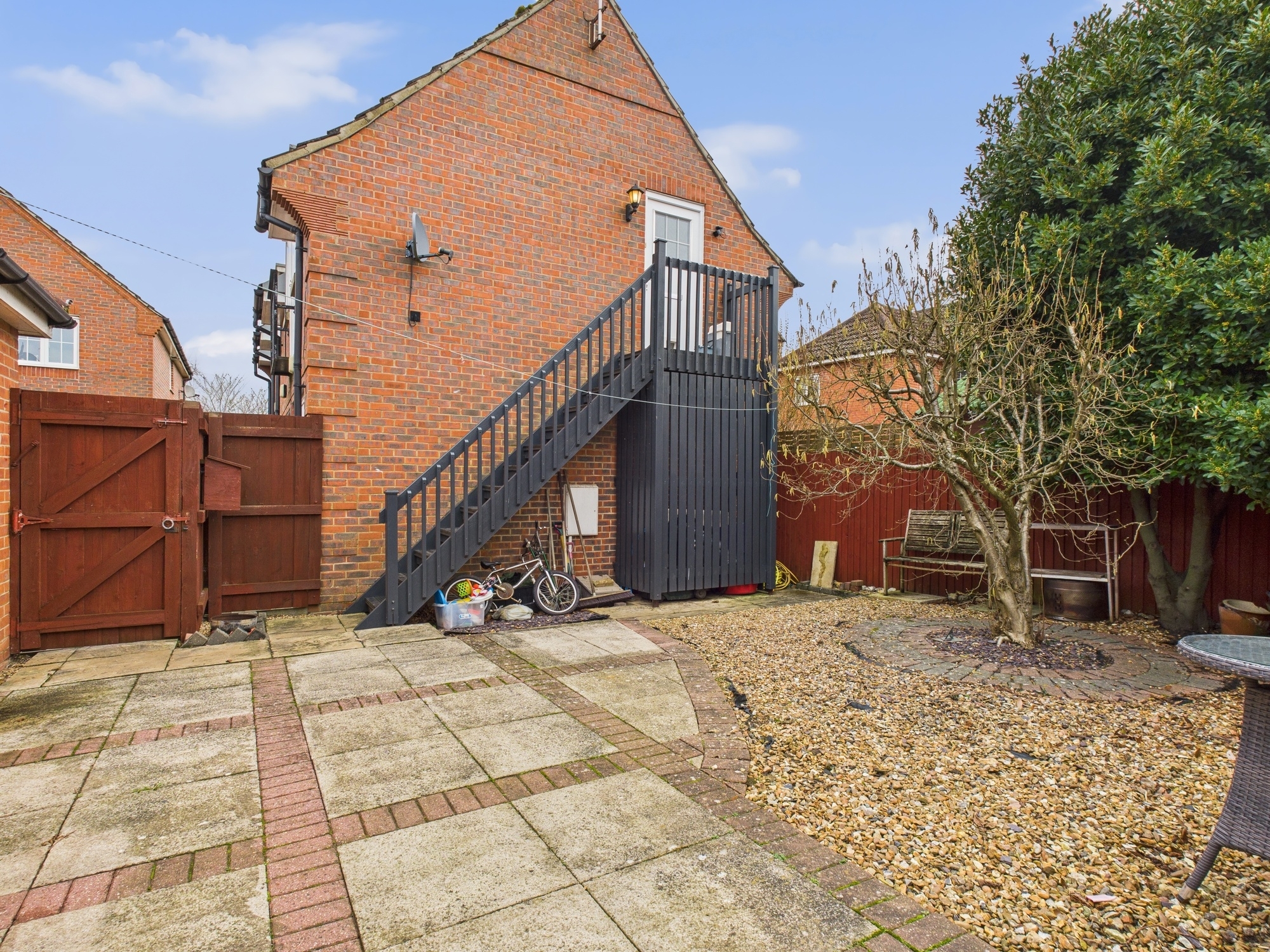 To the front of the property there is a garage with driveway providing off road parking. A private gate leads through to the courtyard garden which is laid to patio with a tree inset and steps lead to the front entrance door.