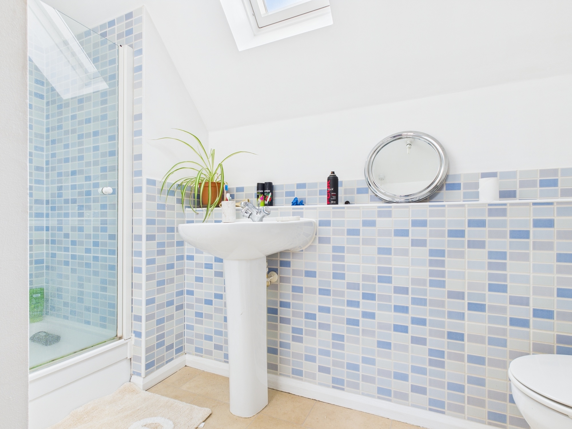 Double glazed Velux style window to rear, shower cubicle with glass door, w.c., pedestal handwash basin, wall mounted double panel radiator, lino style flooring, shaver socket, extractor.